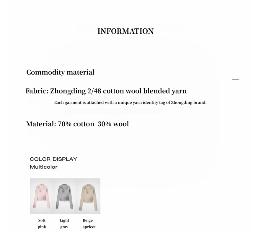 Made of 70% skin-friendly cotton and 30% fine Merino wool, this fabric is blended with double-stranded 48s yarn. It combines the dryness of cotton with the softness of wool, offering a soft, fluffy feel. The fabric is moisture-wicking, breathable, and comfortably cool without being stuffy. It is resistant to pilling, and the ribbed knitting method ensures a dense, elastic texture with strong wrapping ability.