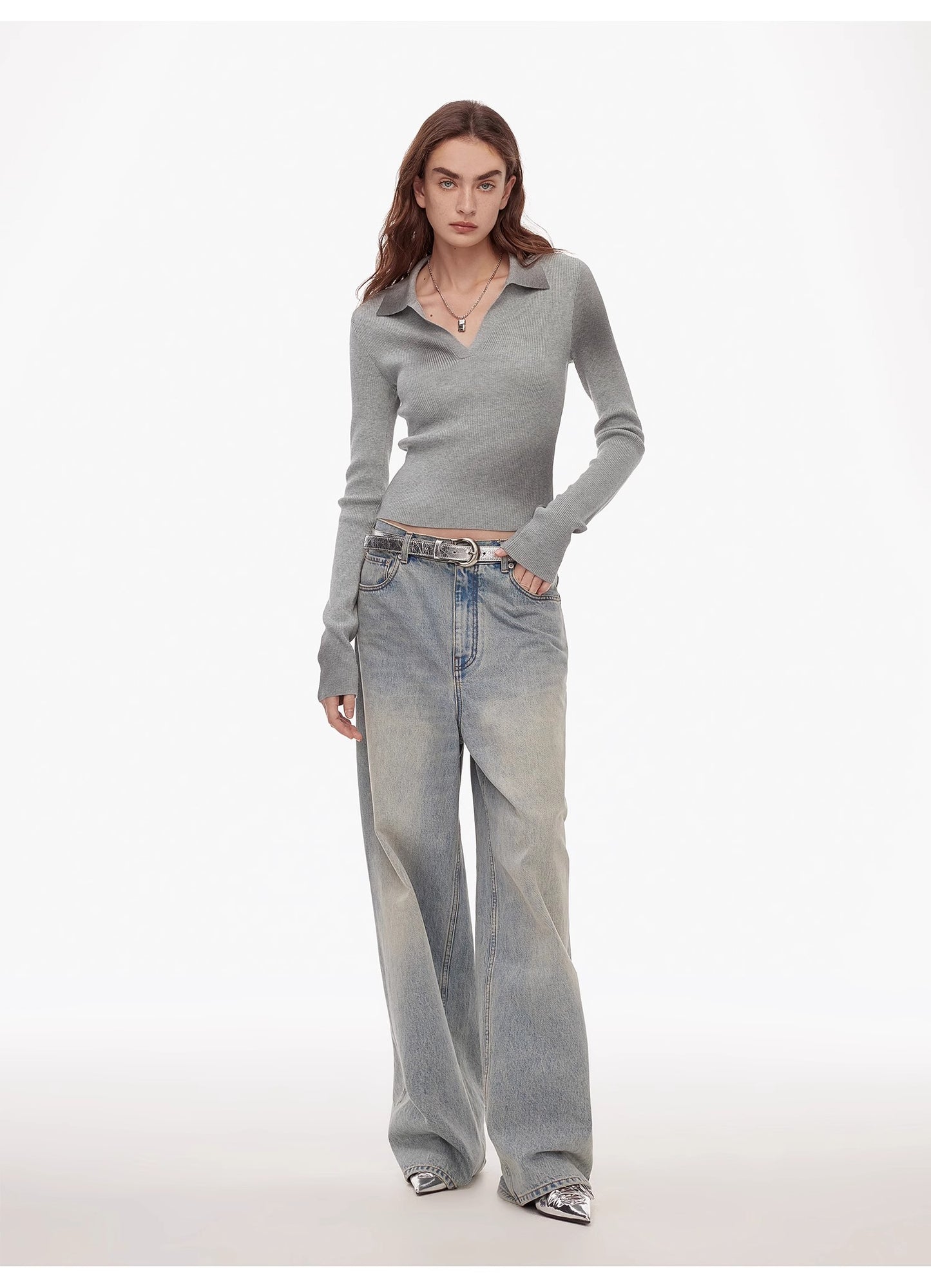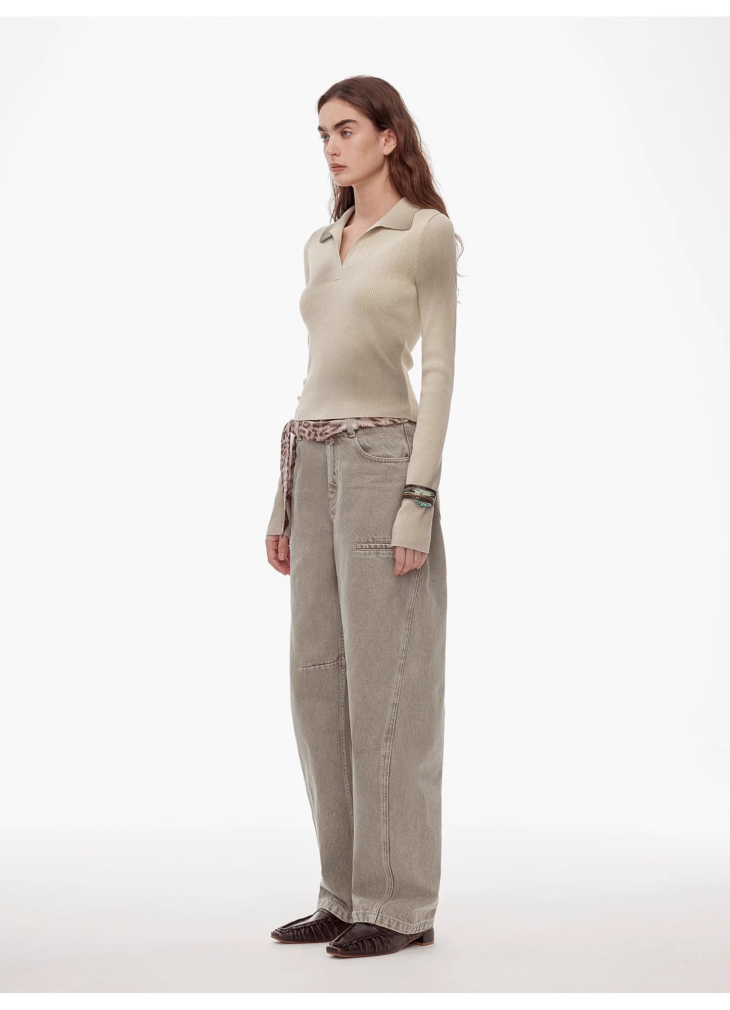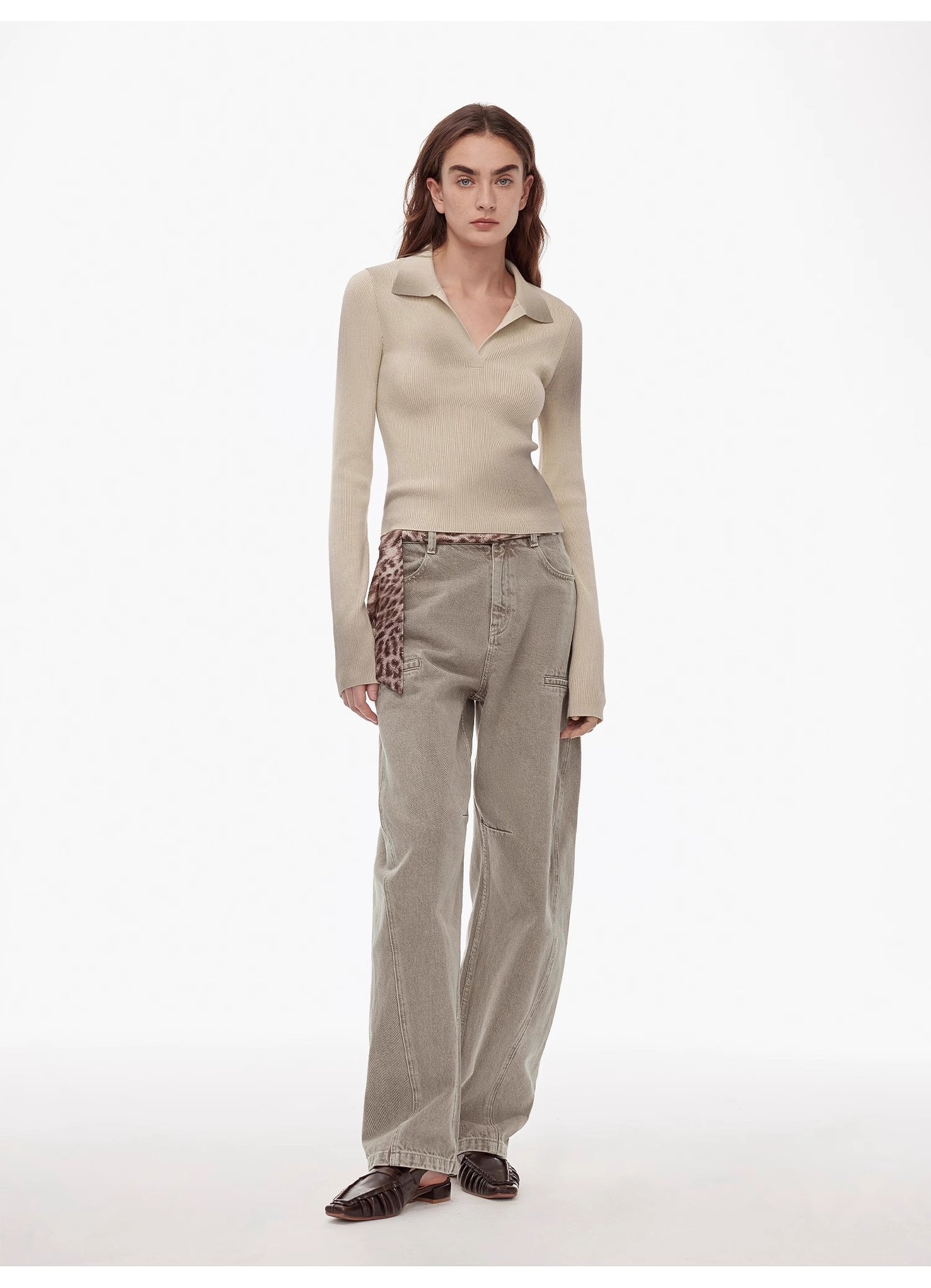 "Artistic Abstract" sfumato distressed printed merino wool waisted polo collar long sleeve short knit sweater