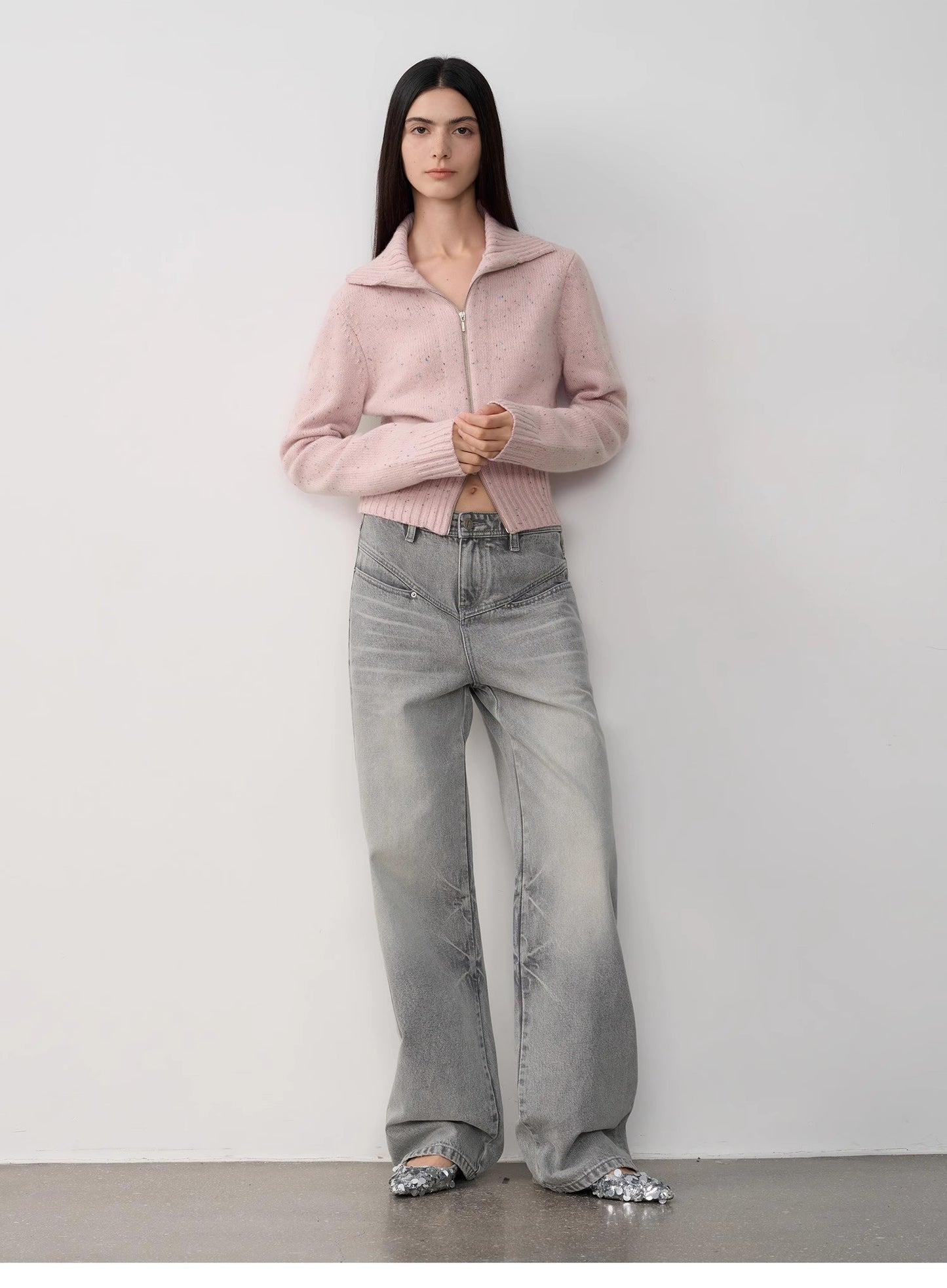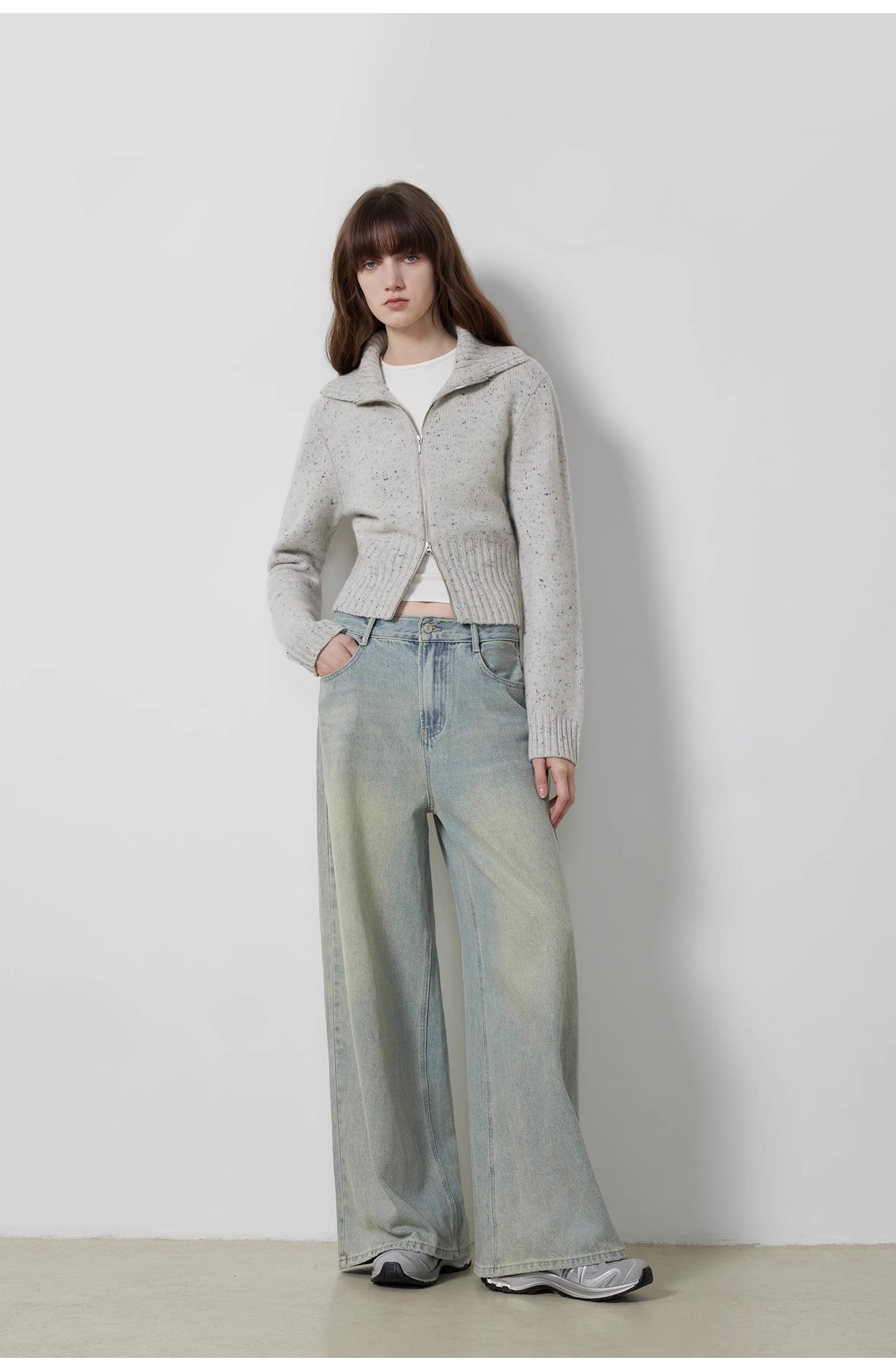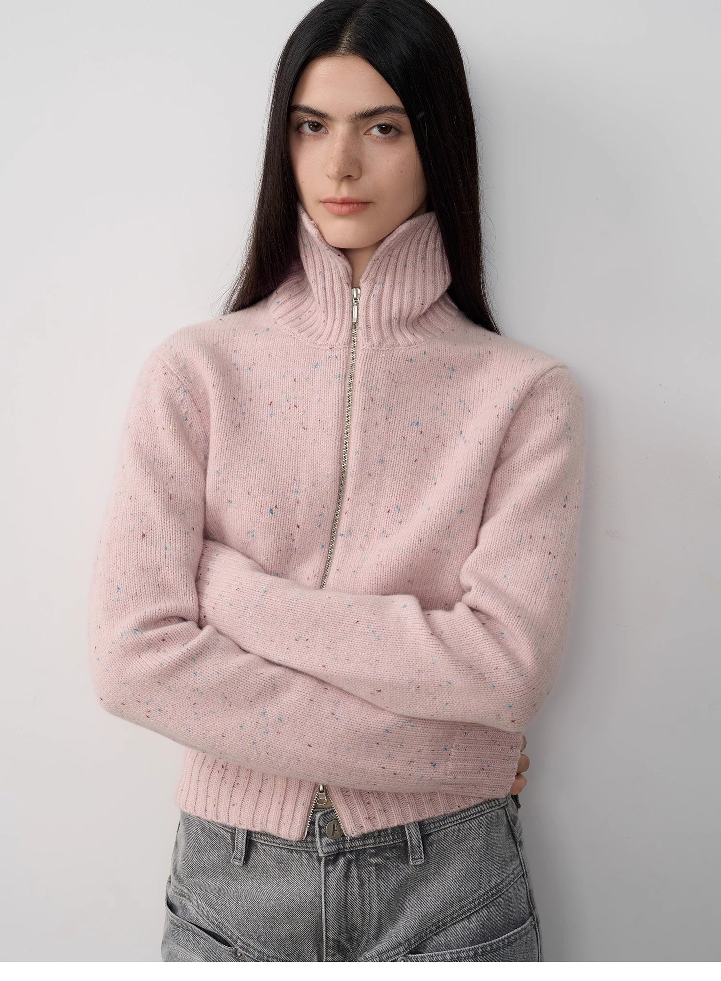 "Autumn Breeze Tea" colorful dotted wool-blend double-zip knitted cardigan short stand-up collar sweater