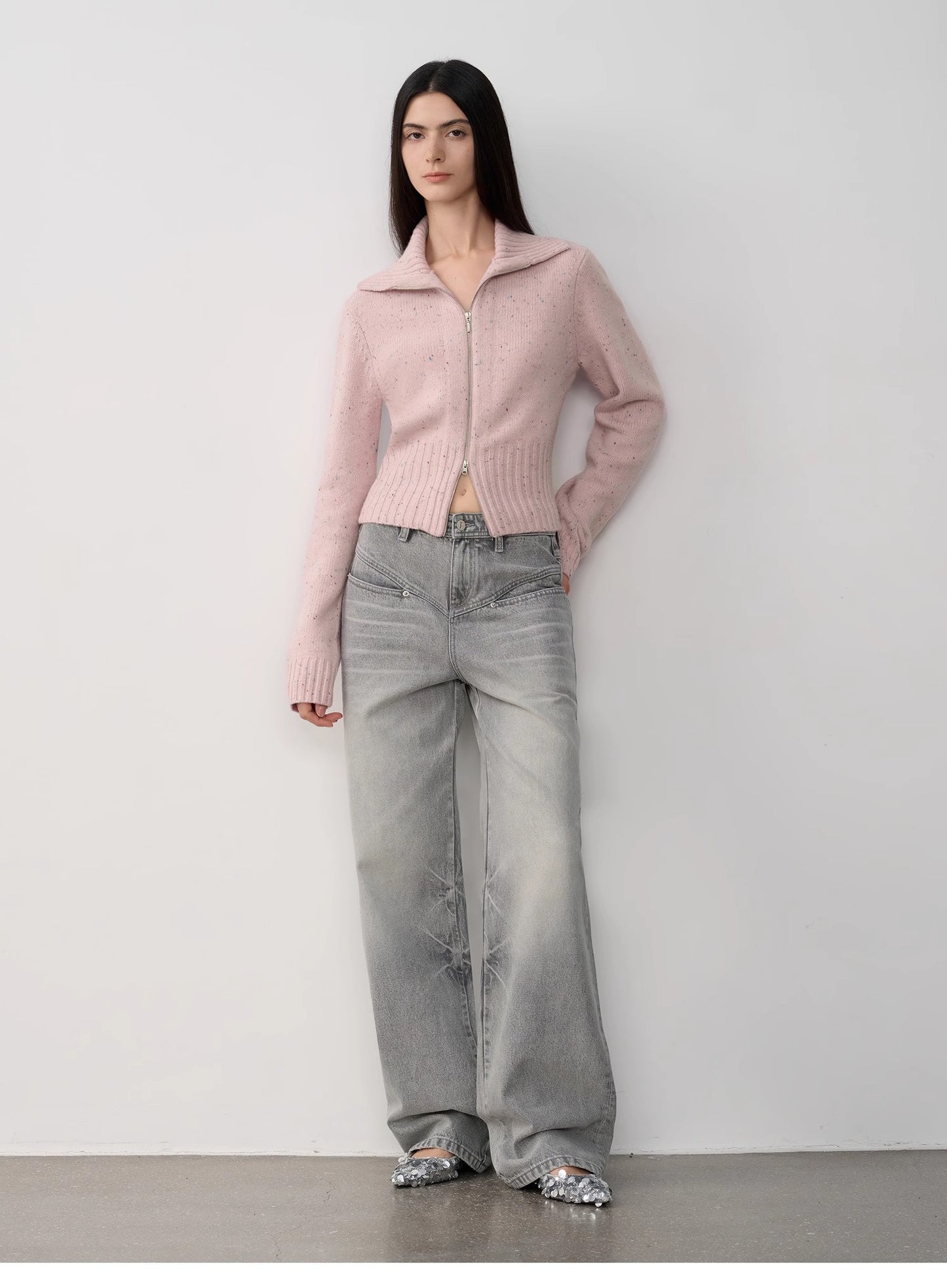 Double zipper, flip collar knitted cardigan with elegant high-end texture, creating a fashionable new trend