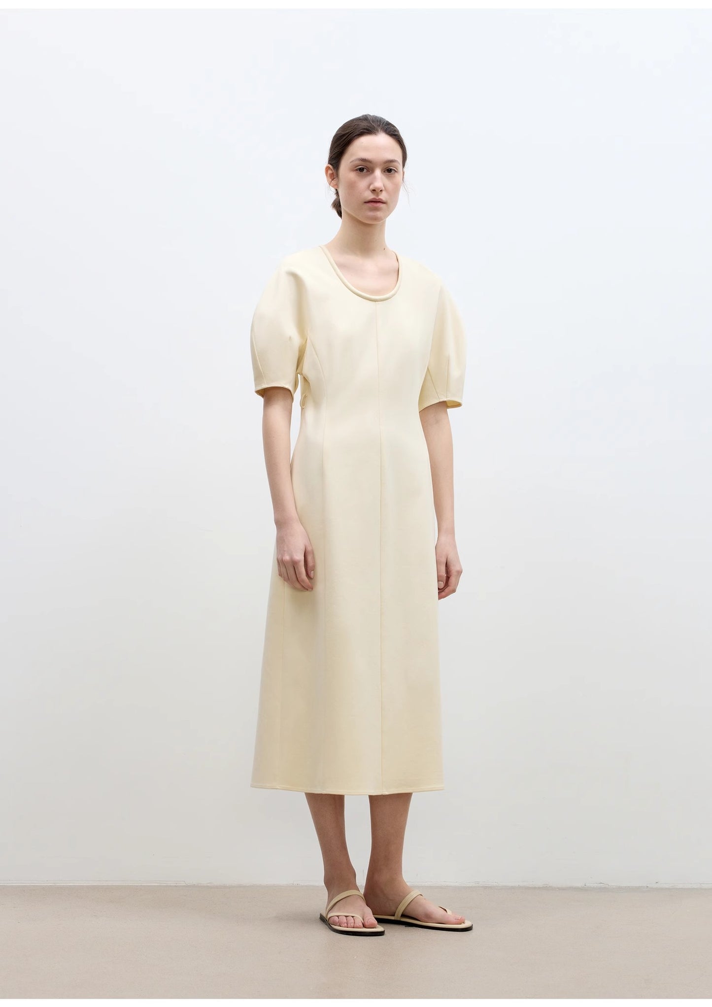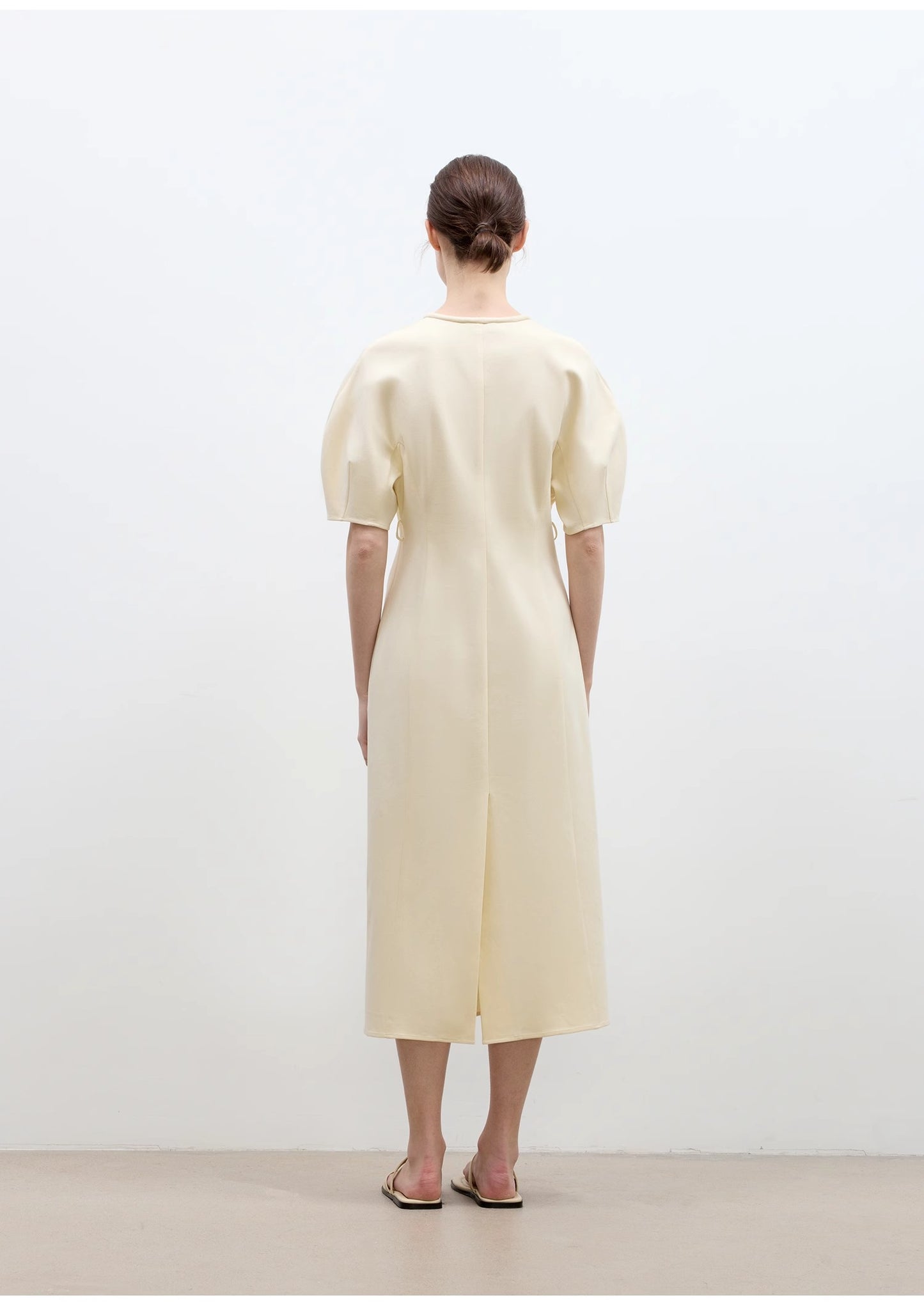 The cotton fabric is treated with a micro-mercerization process to create a slightly wrinkled texture. The finished garment is wide and stylish with full short sleeves, which are light and elegant. The cotton rope at the neckline creates a three-dimensional U-neck, which modifies the neck and face shape, and the waist is decorated with a cotton rope belt in the same color. The details echo each other, making it more casual and smart.