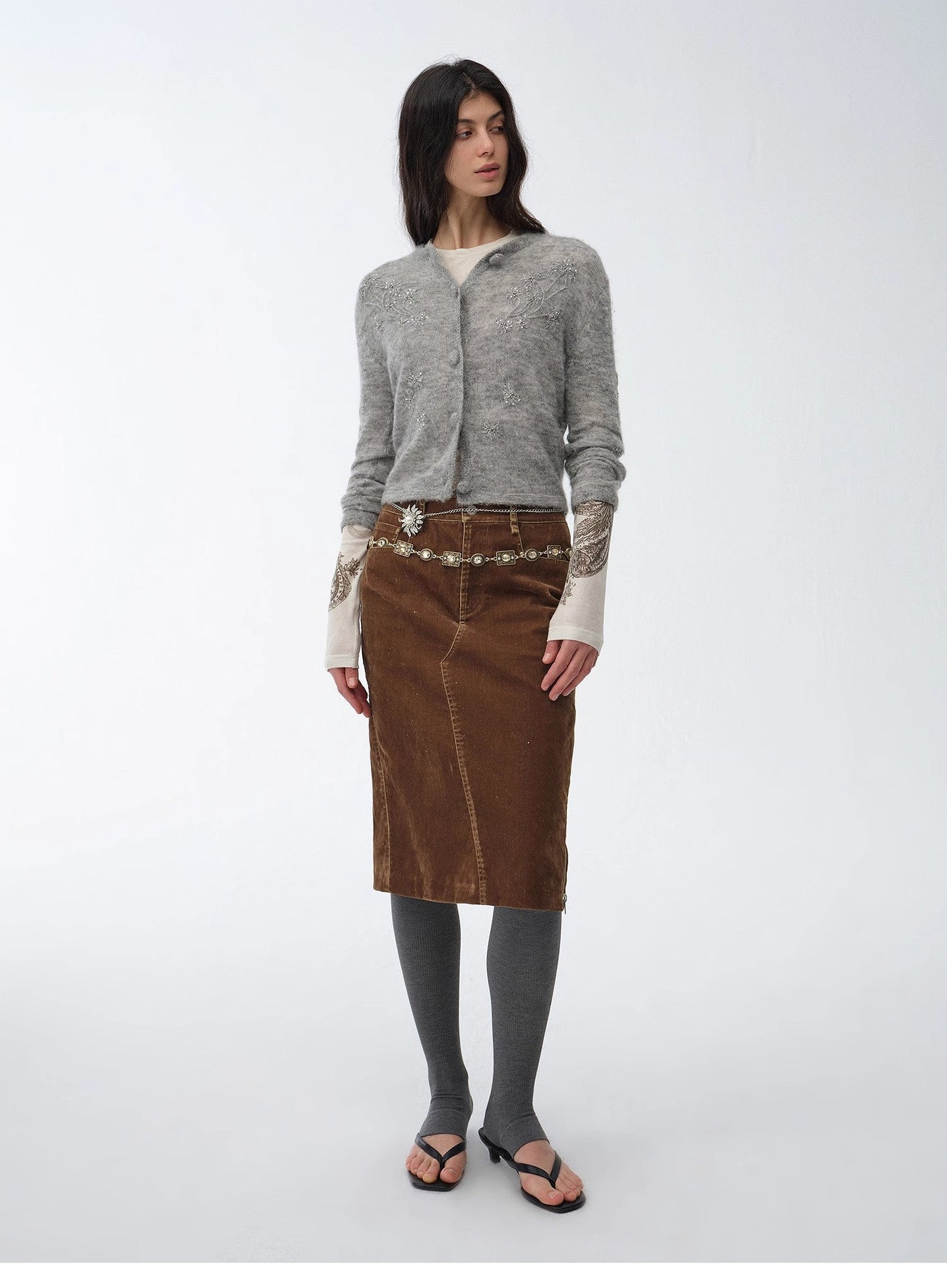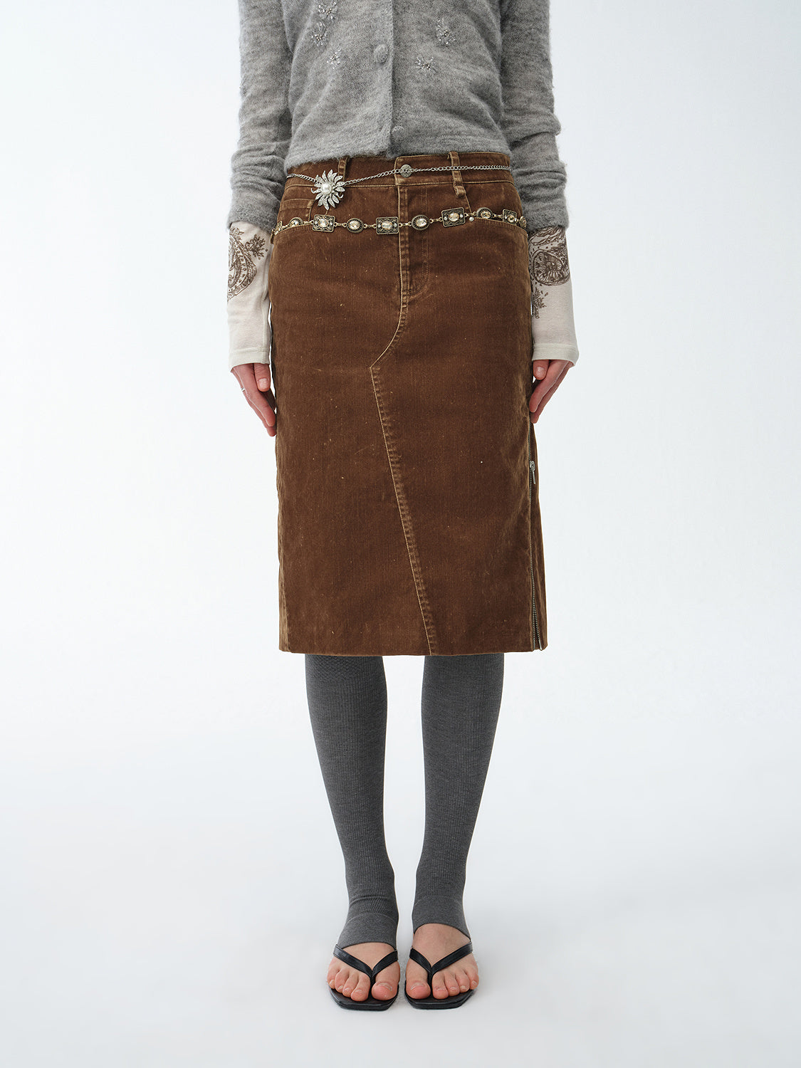 "Early Spring Sun" Retro Distressed Flocked Denim Straight Skirt Side Zipper Slit Skirt