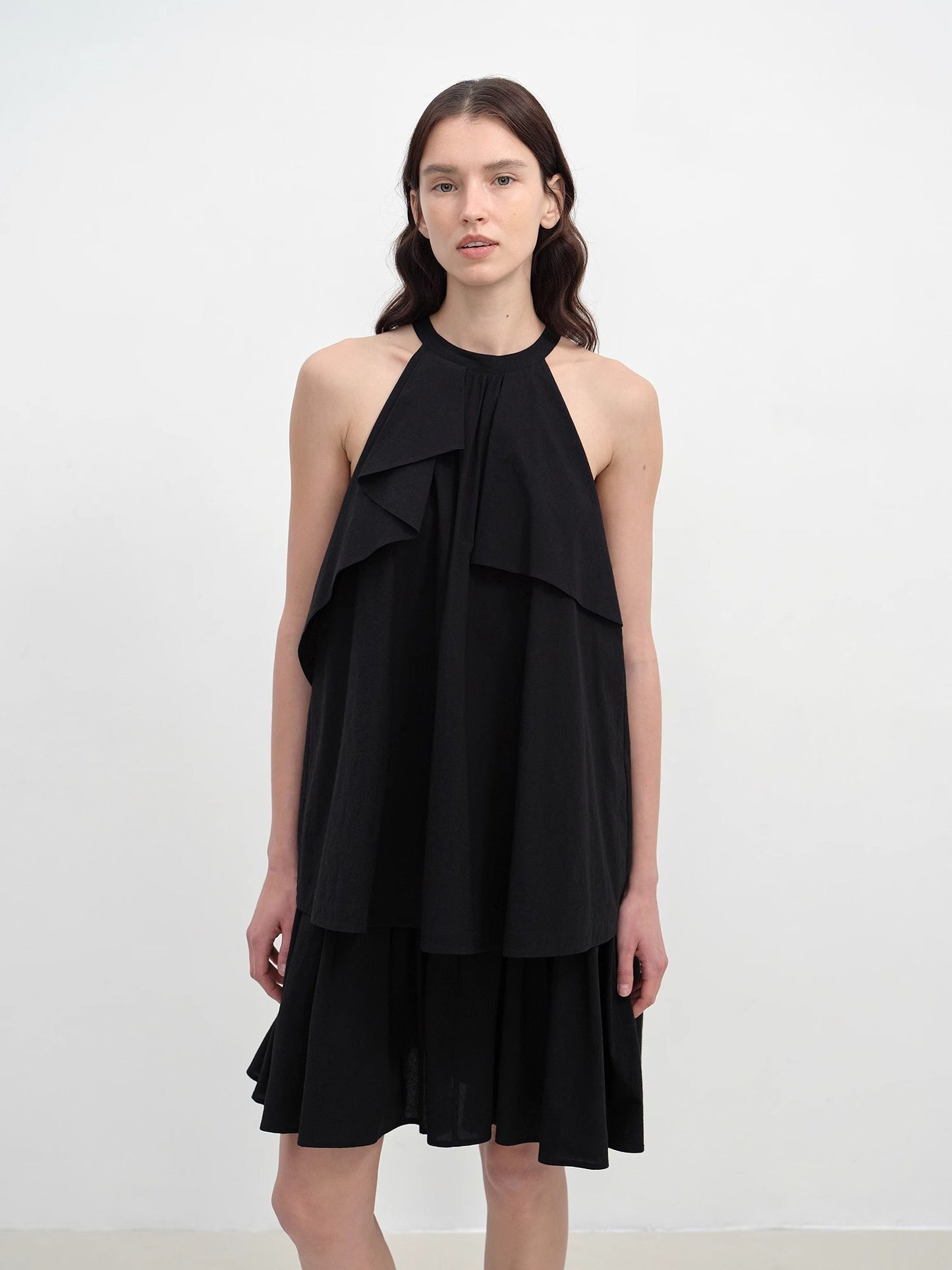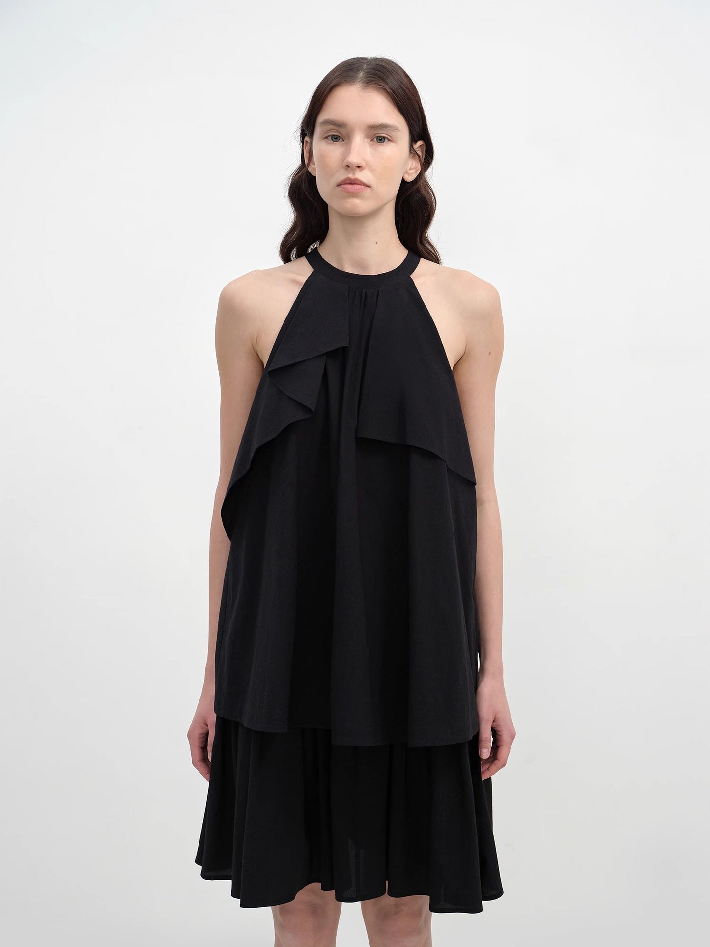 Unique small grain textured cotton fabric, wide and stylish, skin-friendly and breathable, rich visual layers, halter neck shape modifies the shoulder and neck lines and shows elegant temperament, asymmetrical pleated shape of the neckline adds a sense of design, small A-line version adds elegance, smart and slim.