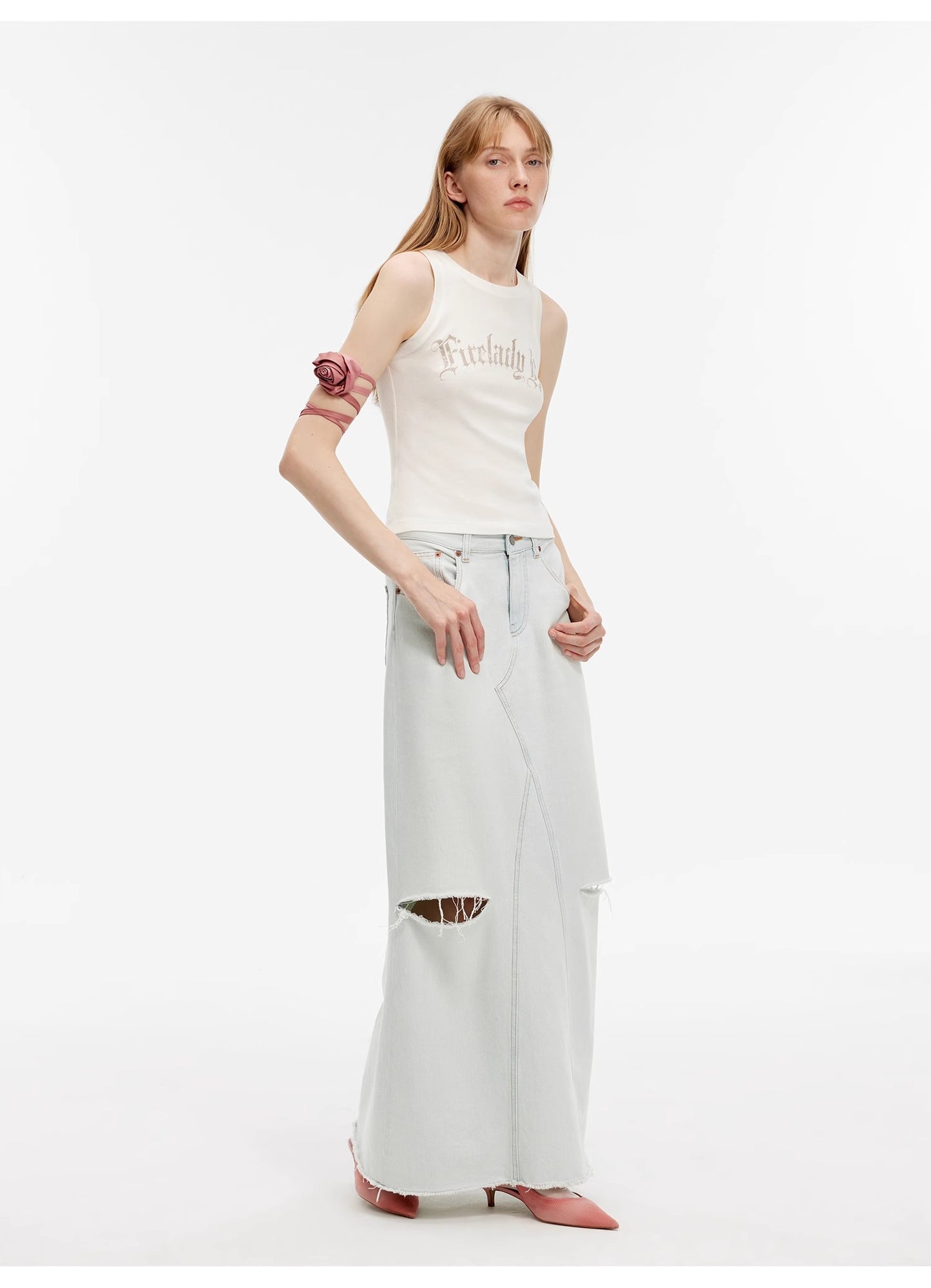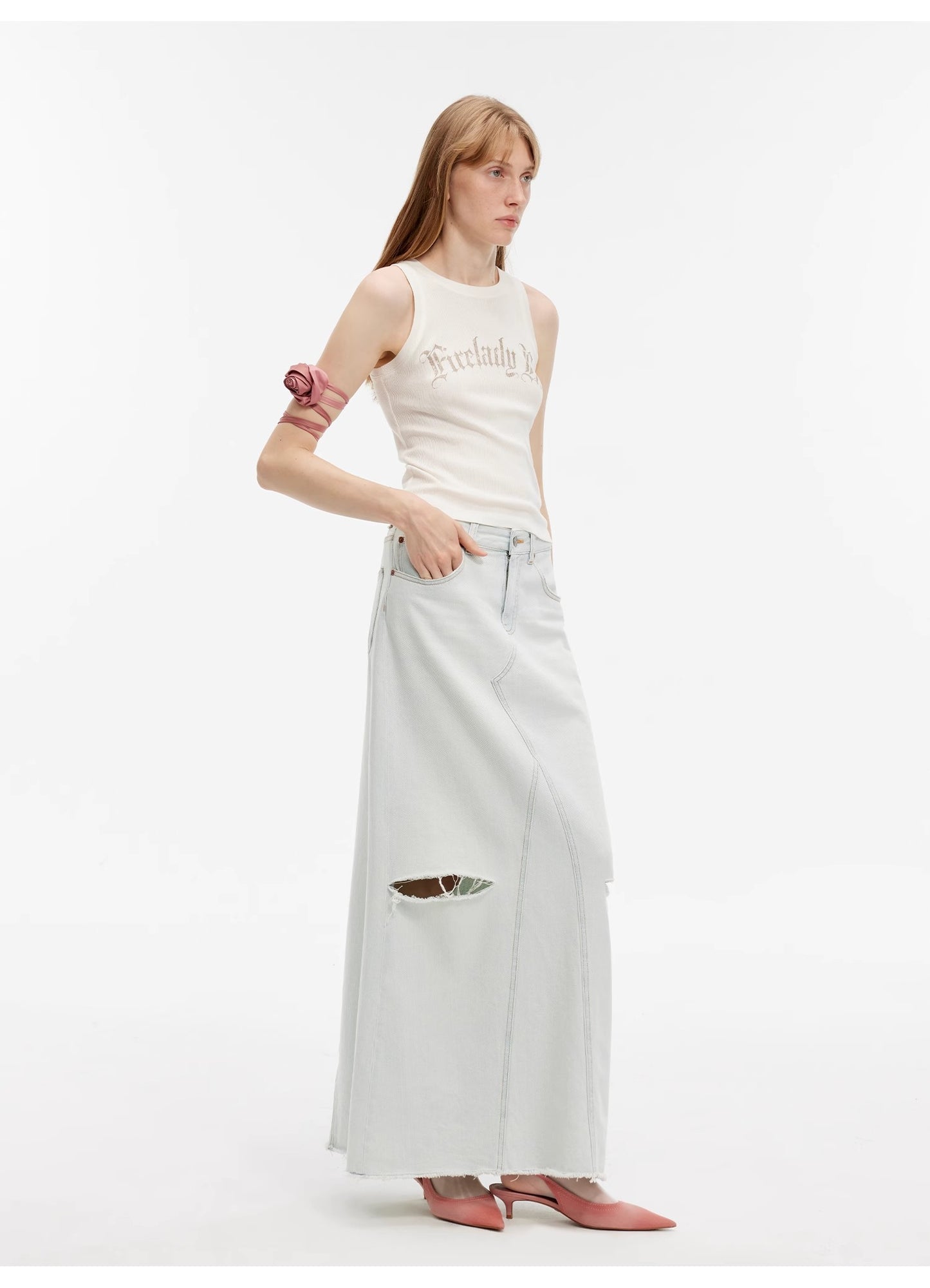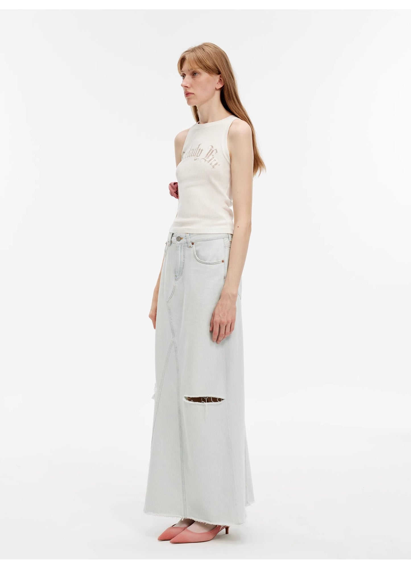"Walden Pond" Turkish Imported Wash-faded Distressed Hole Denim A-line Skirt