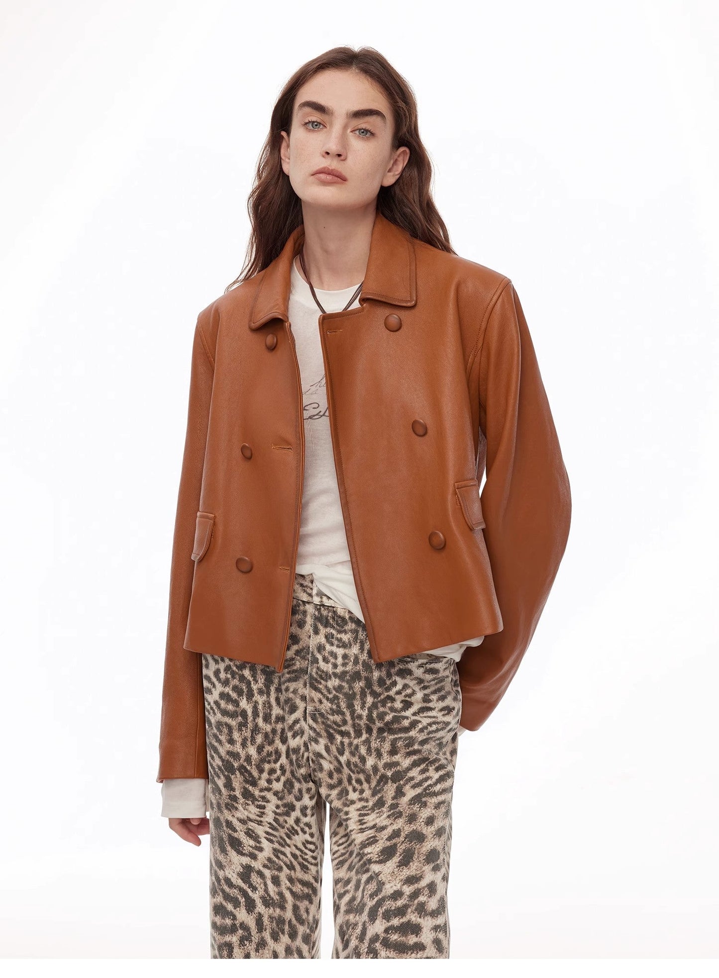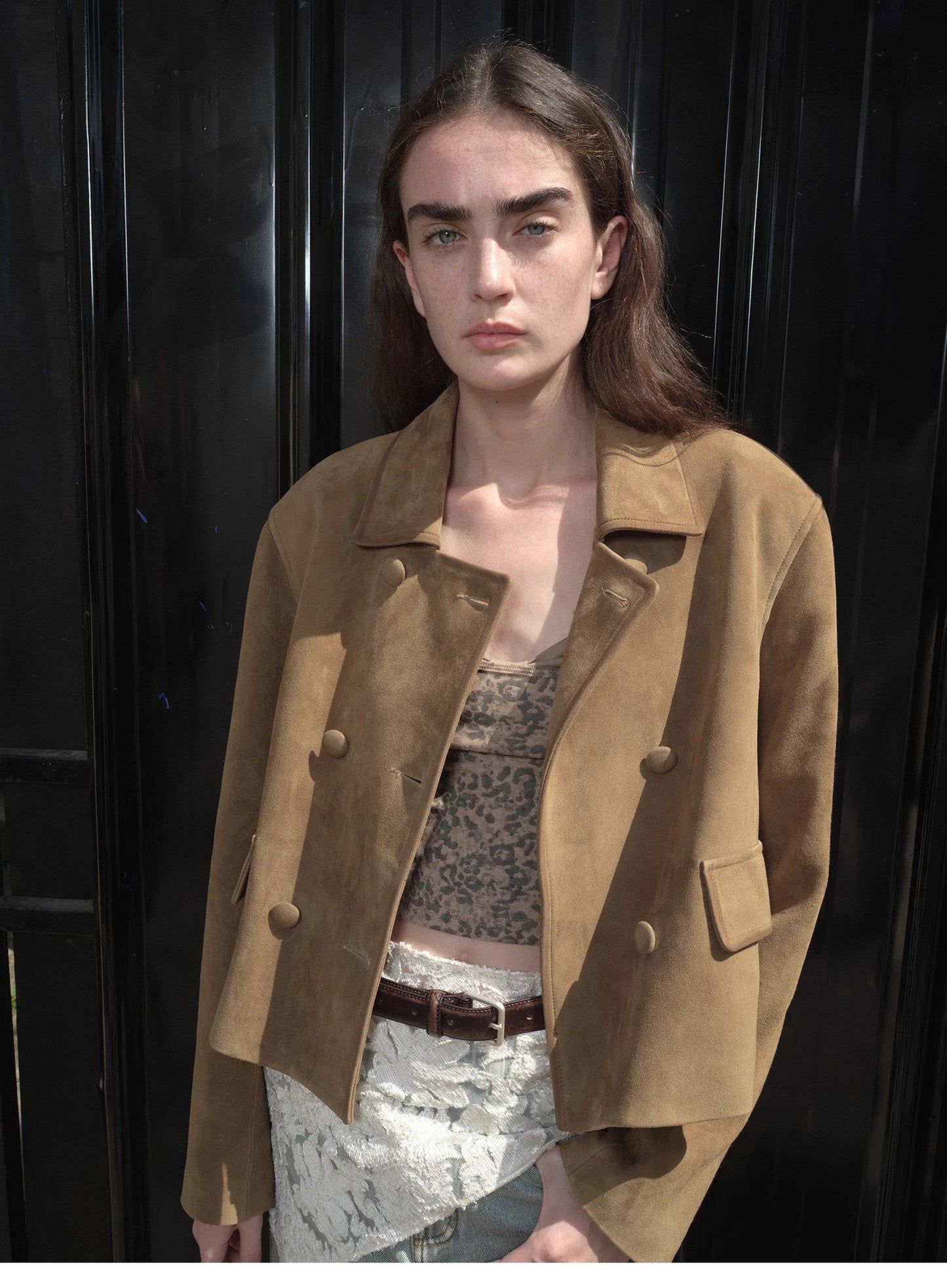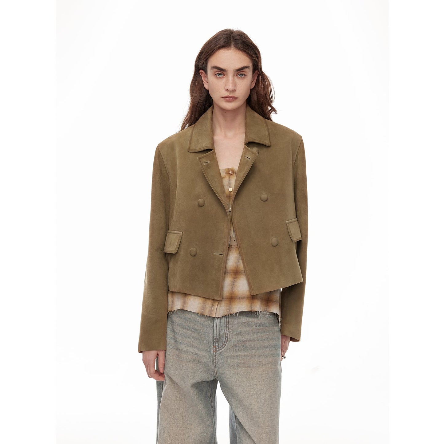 "Nth power" suede lambskin retro double-breasted lapel wide-shoulder genuine leather jacket imported from New Zealand
