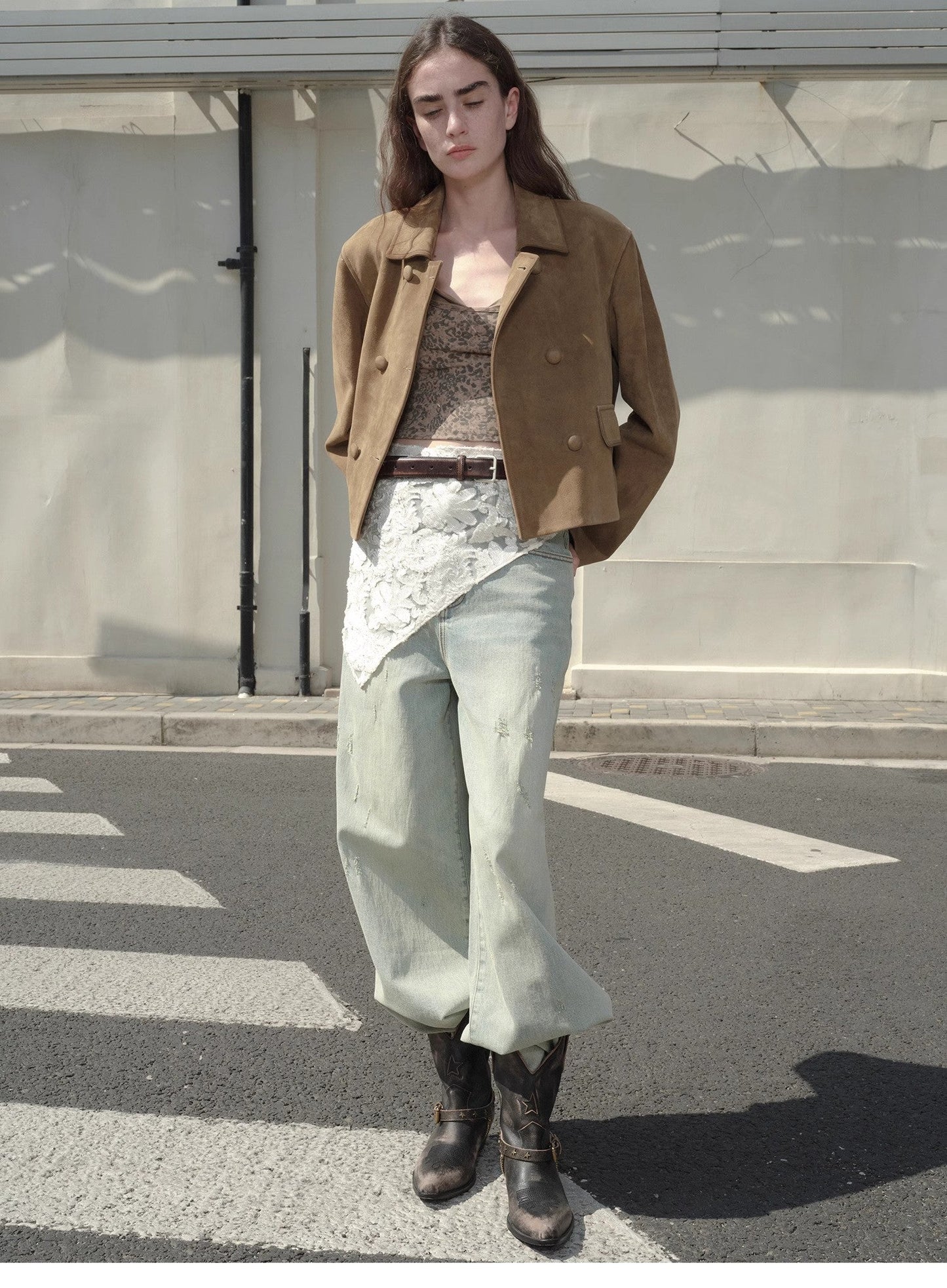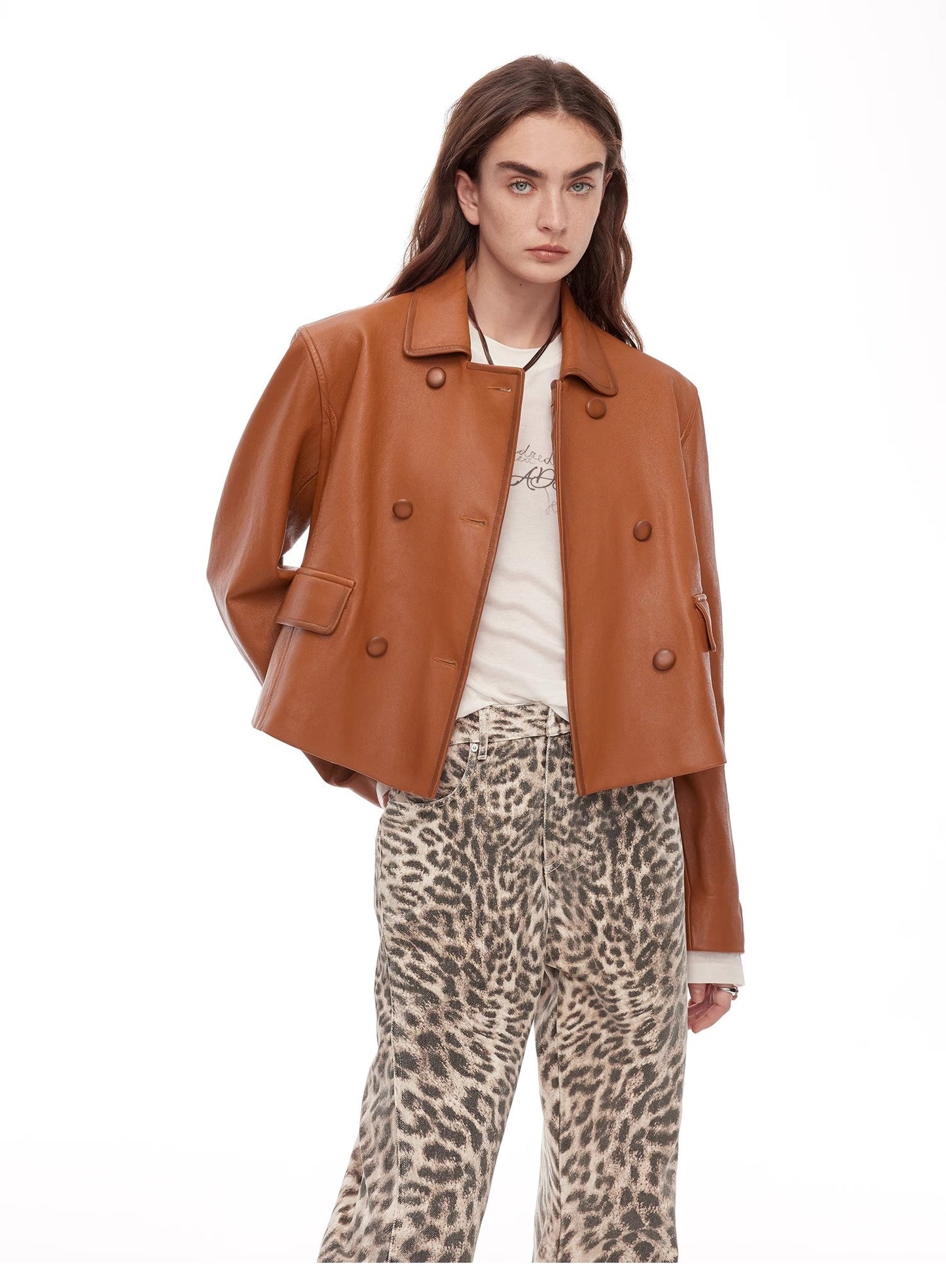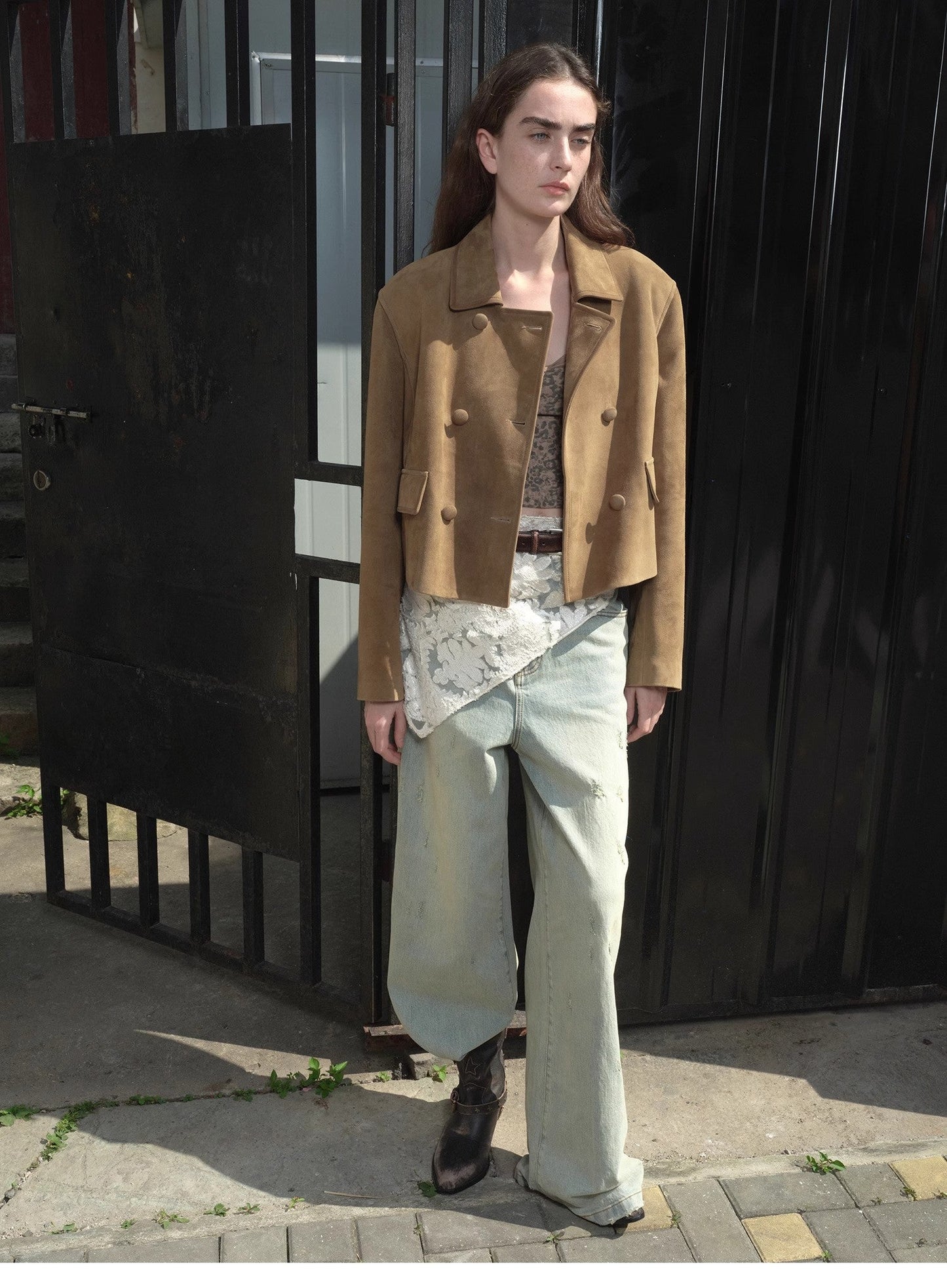 "Nth power" suede lambskin retro double-breasted lapel wide-shoulder genuine leather jacket imported from New Zealand