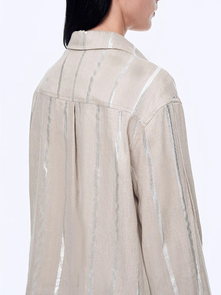 Made from naturally retted flax, this premium linen fabric balances a smooth touch with a structured feel. Woven with silver stripes using yarn-dyed technology, it exudes a refreshing yet vintage charm. The fabric is wrinkle-resistant, breathable, drapes beautifully, and is easy to care for—offering effortless elegance and comfort.