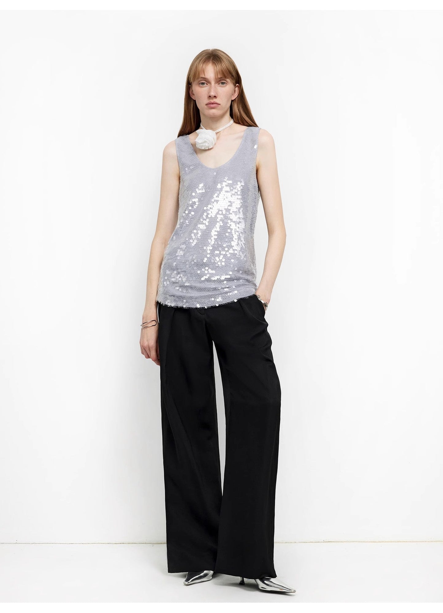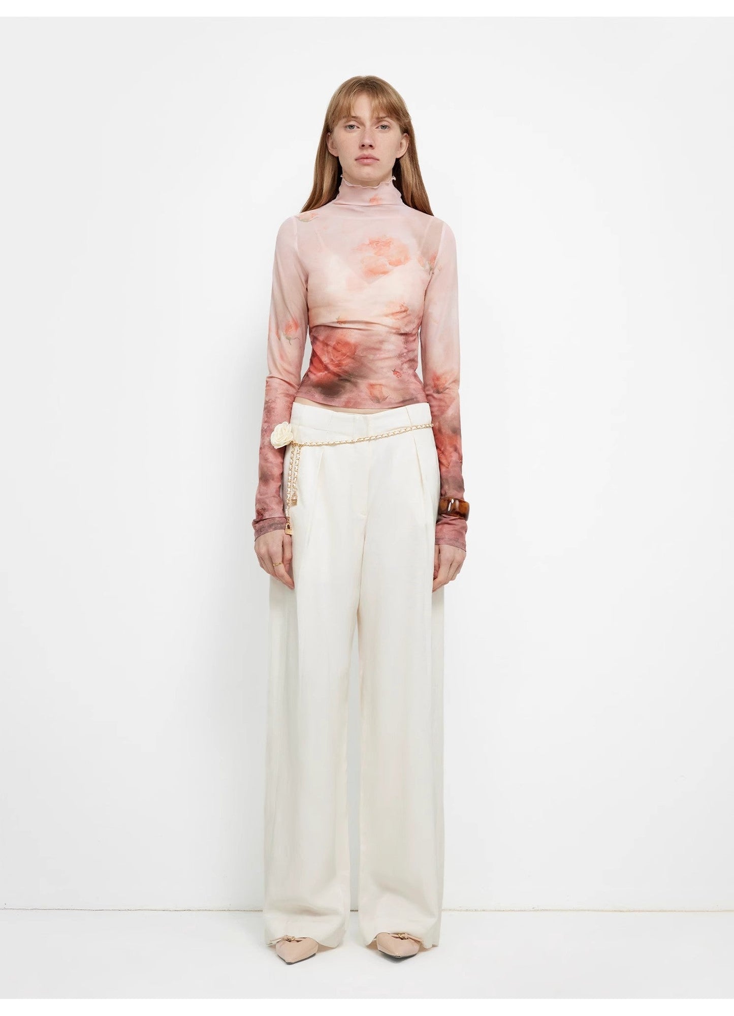 These mid-waist, draped straight-leg pants feature a generous amount of fabric in the legs, perfectly flattering various body types and leg shapes. They contour to different waist and abdominal curves, effortlessly optimizing body proportions and creating a slimming effect. The diagonal single pleat and split seam details add a layered, textured look, visually expanding the width of the pants and balancing the space and freedom of movement in the legs. These pants are universally flattering and suitable for all body types.