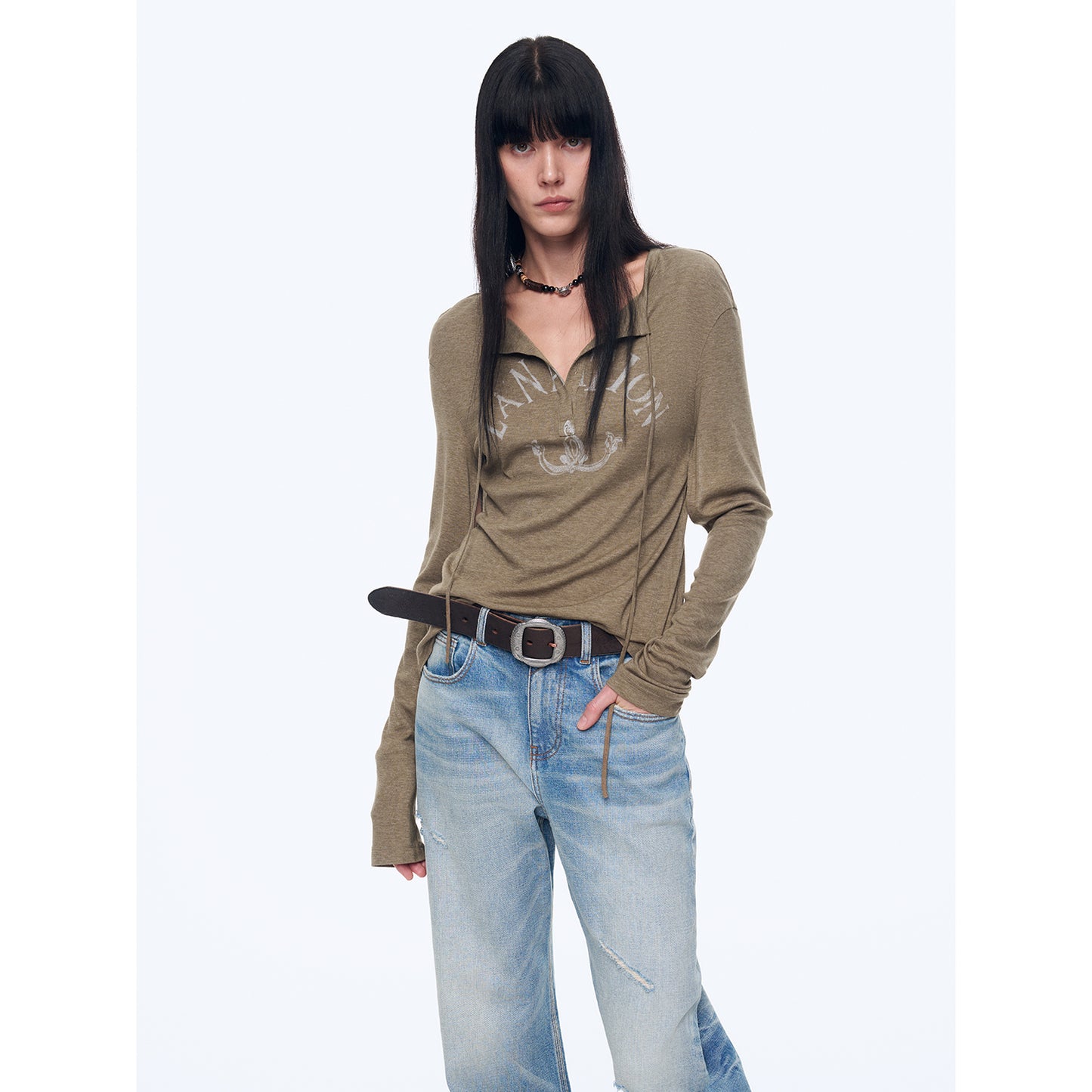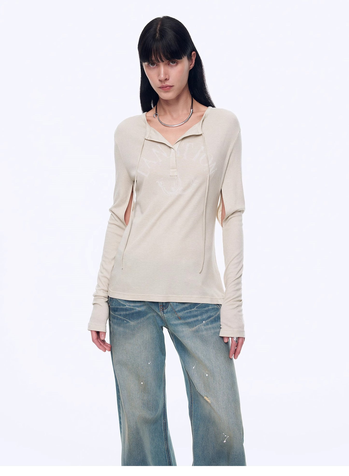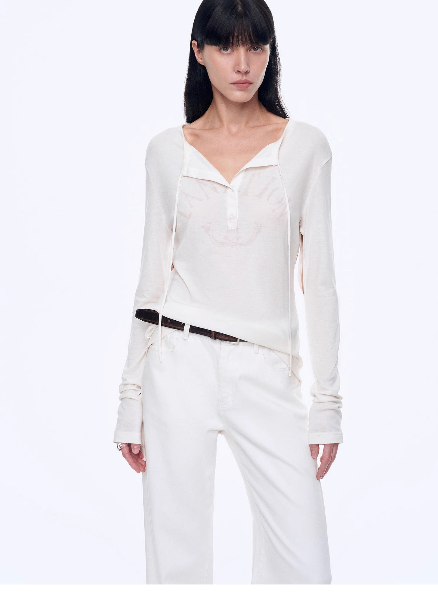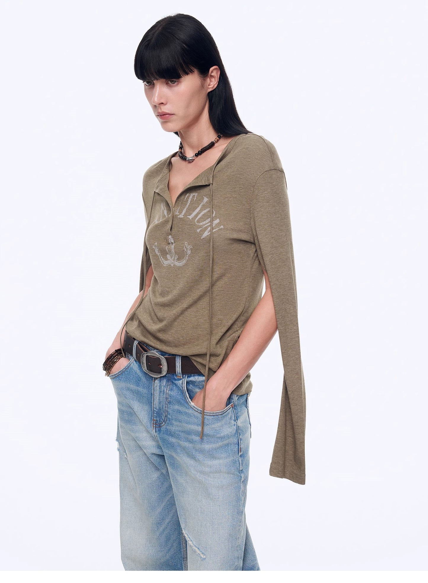 "Minimal Message" ethnic print modal knit henley collar tie long sleeve T-shirt top