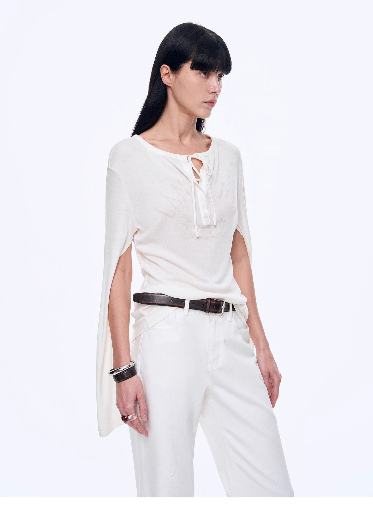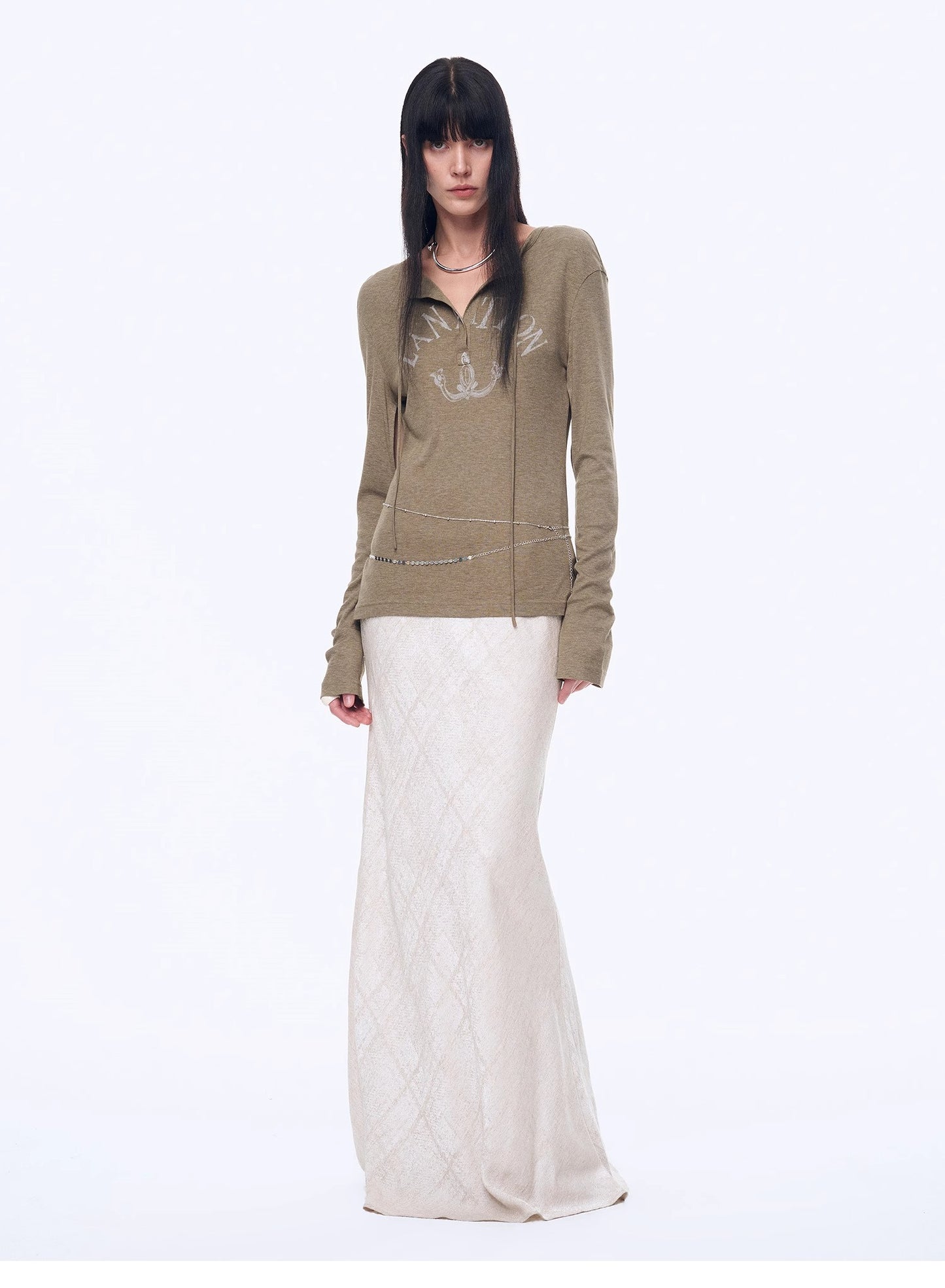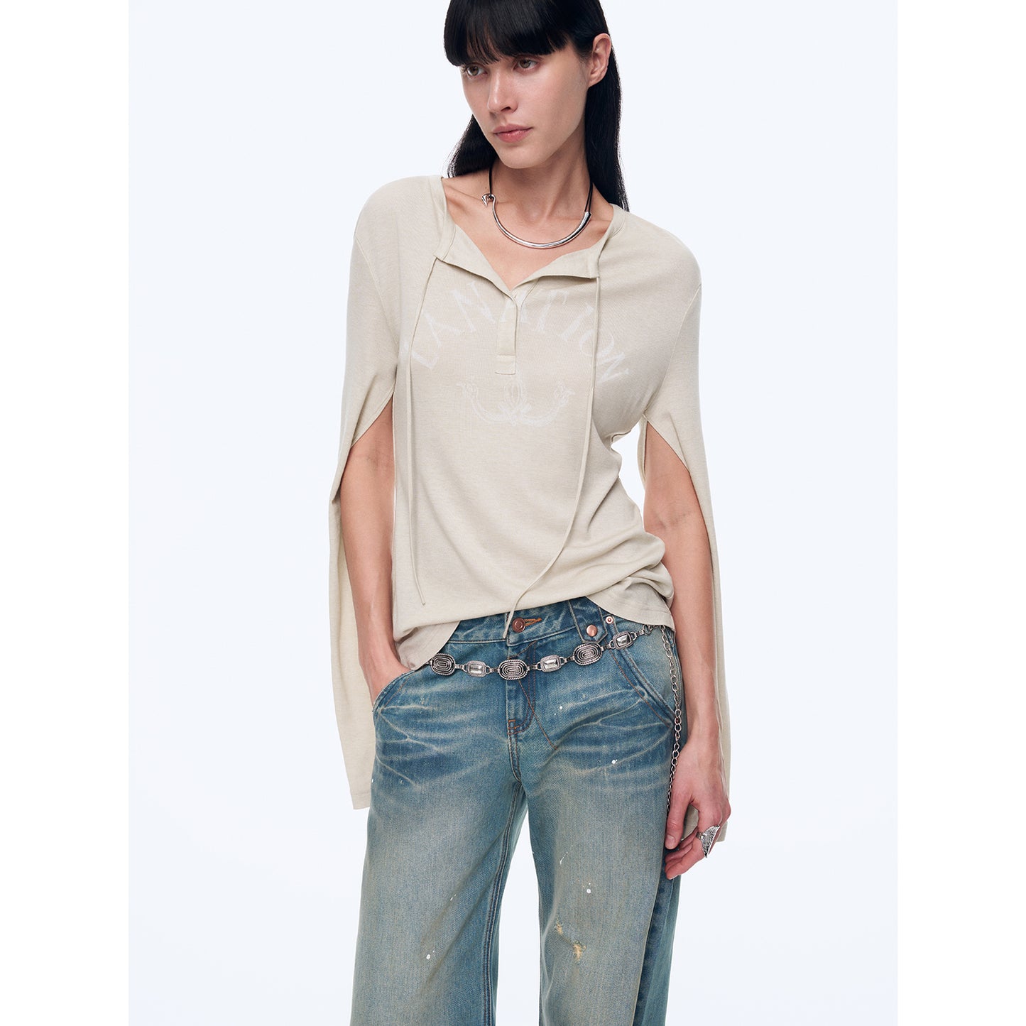 "Minimal Message" ethnic print modal knit henley collar tie long sleeve T-shirt top