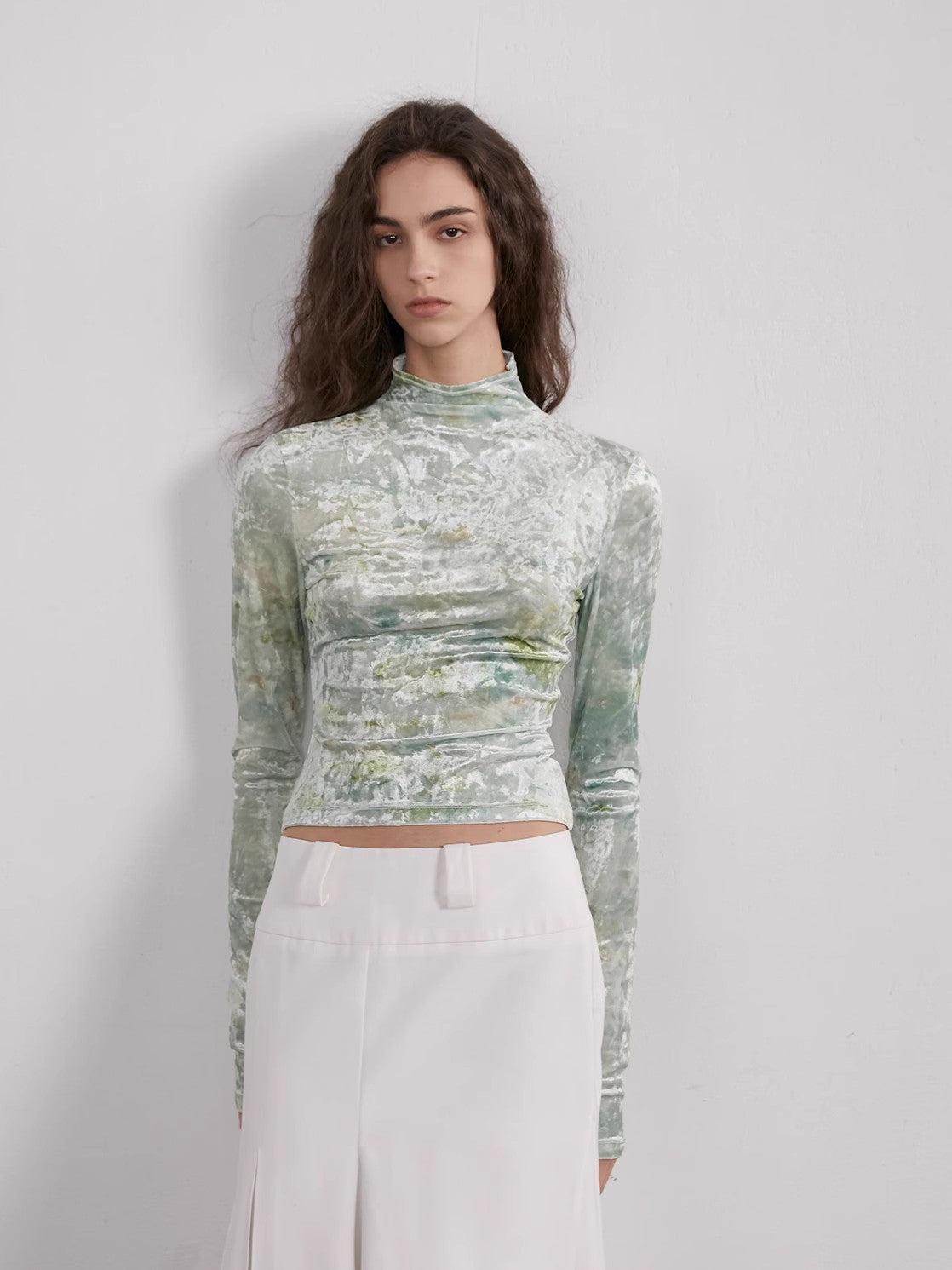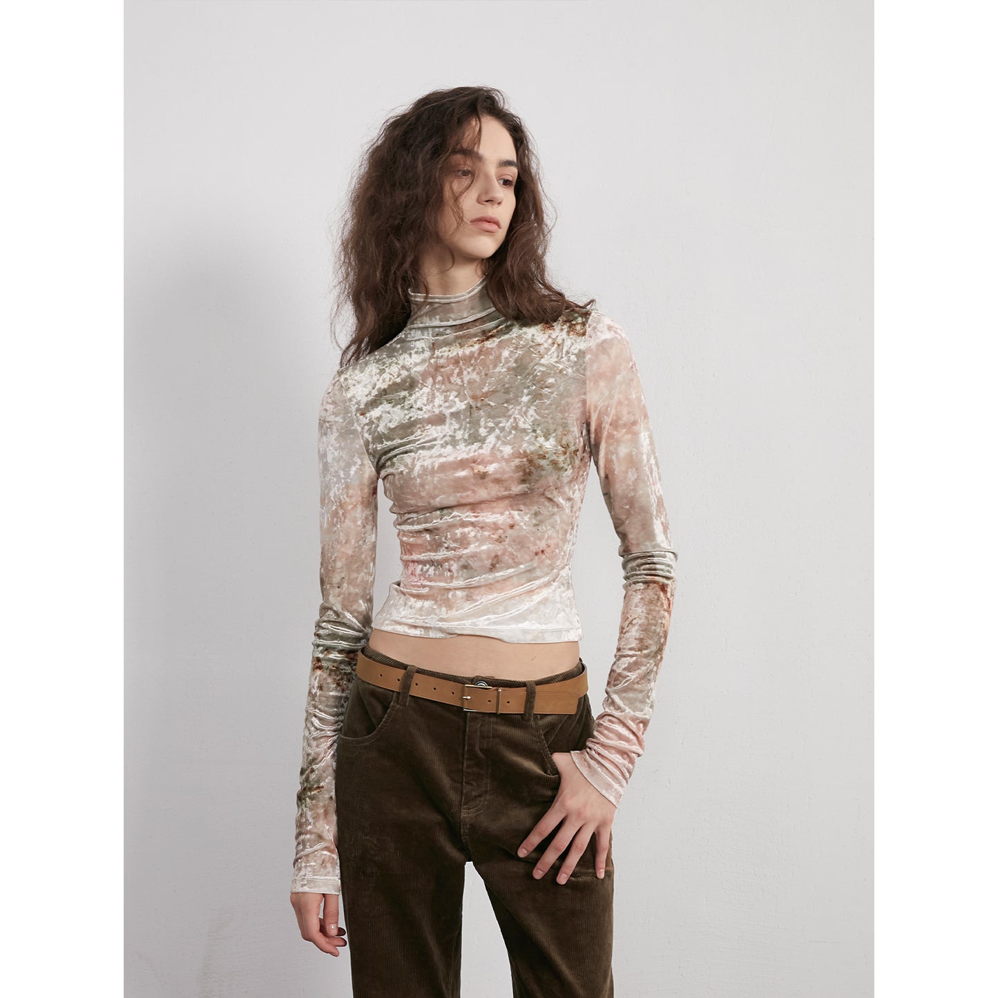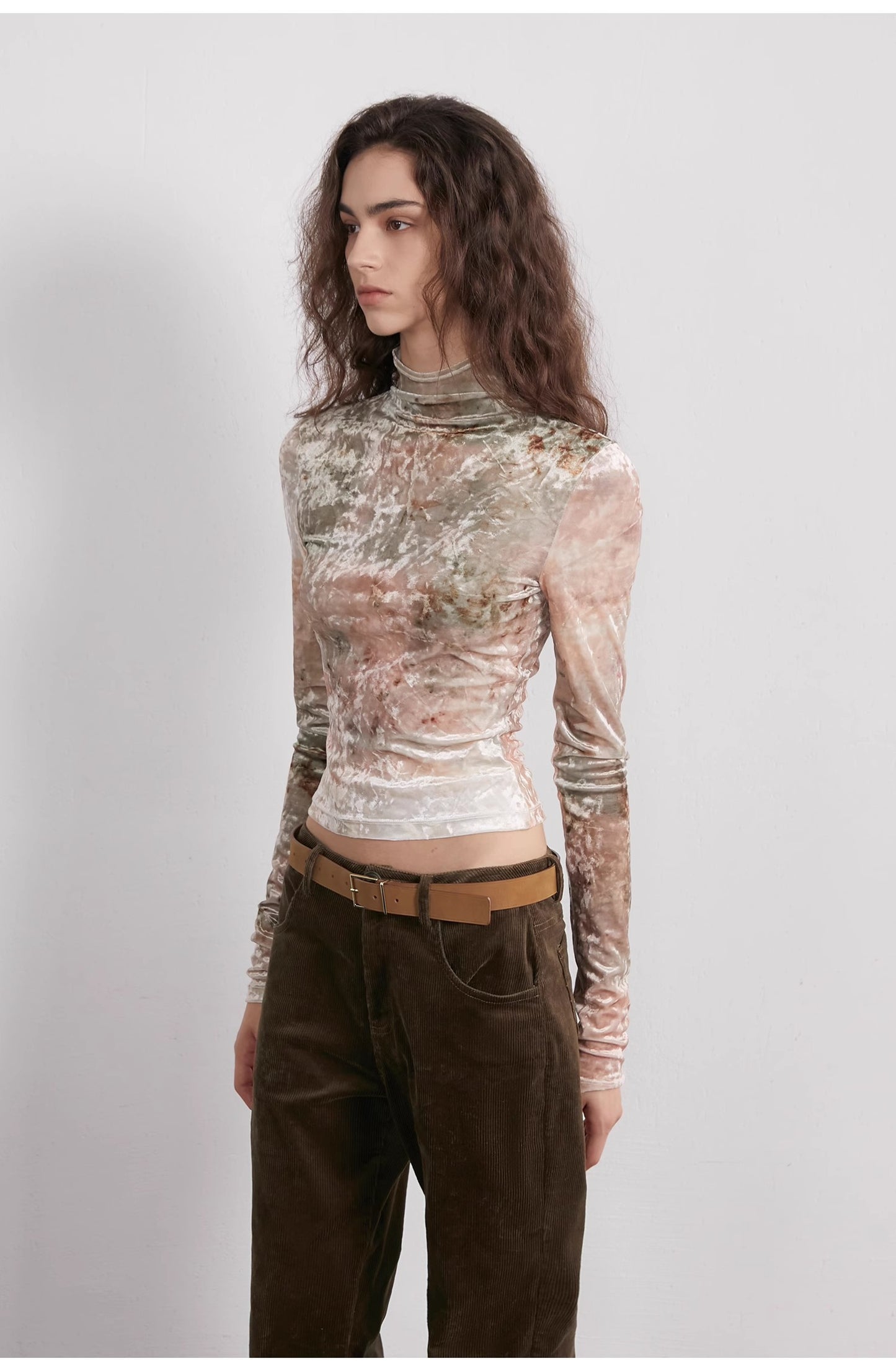 "Warm Sugar Latte" Smudge Print Velvet Long Sleeve Bottoming Shirt Women's Half Turtleneck T-shirt
