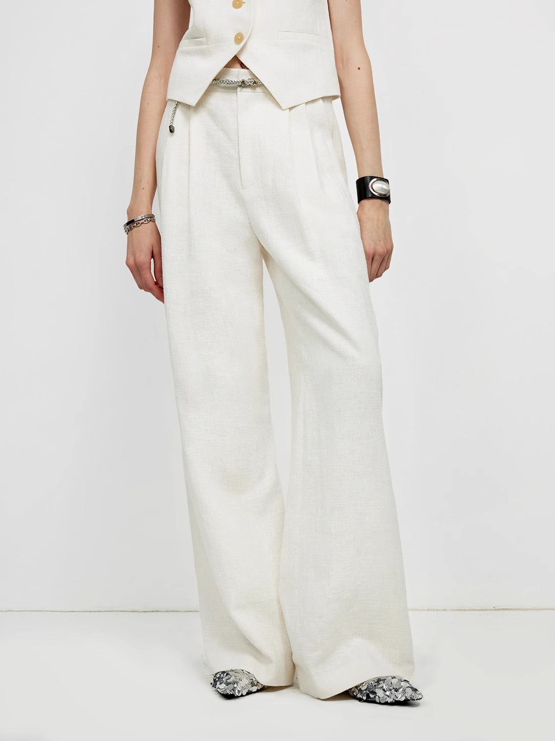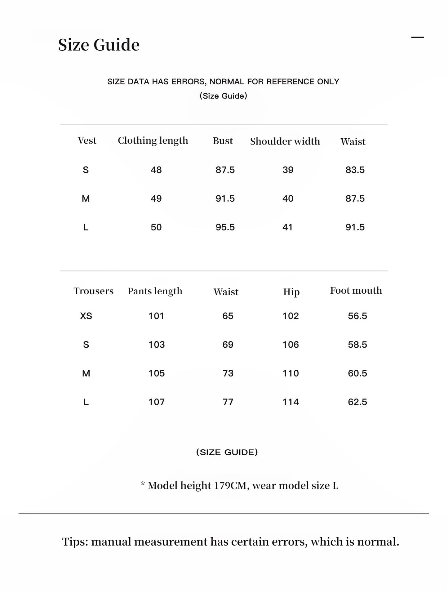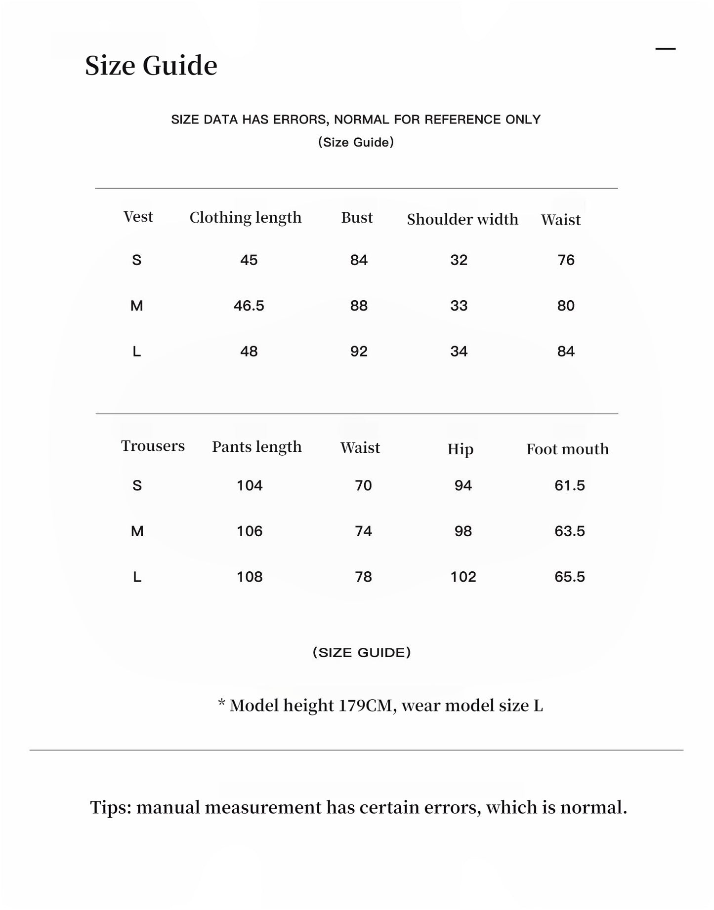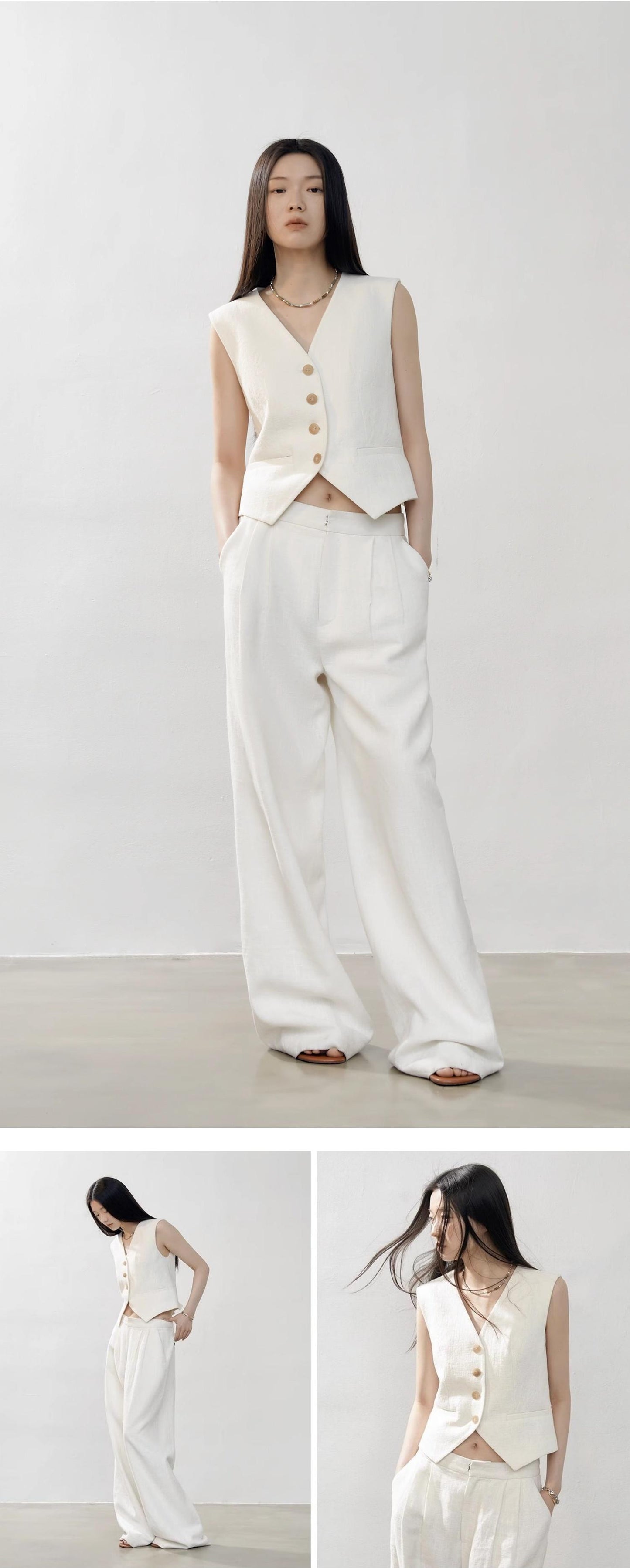 Classic fitted vest small jacket, lengthened depth V-neck, elongate neck line. High slit inverted V design at the hem, stretching the proportion of the lower body. Ultra loose wide-leg suit pants, pants with space, smooth air circulation, wearing a sense of comfort and relaxation without a sense of constraints.