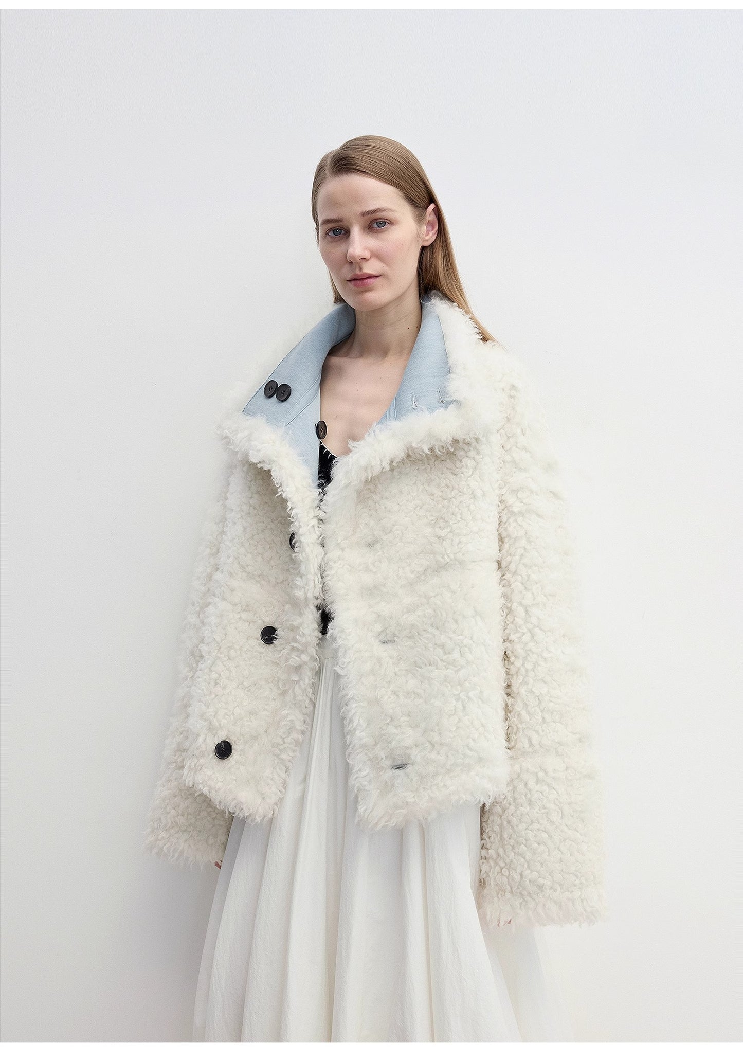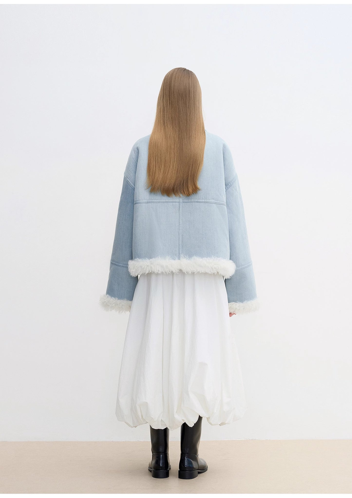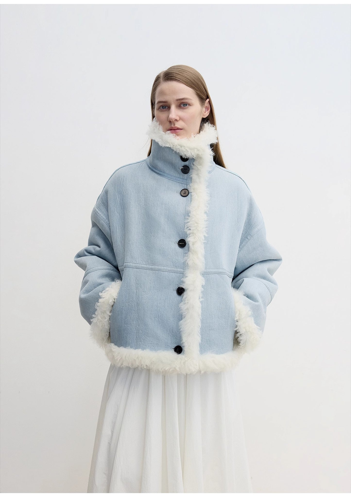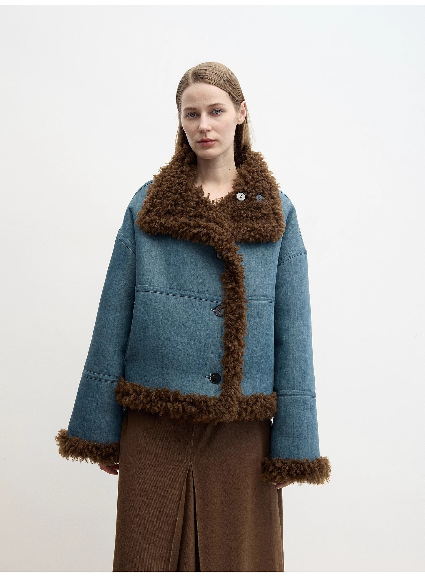 "Mint Glacier"Flip Collar Reversible Shearling Denim Wool Jacket