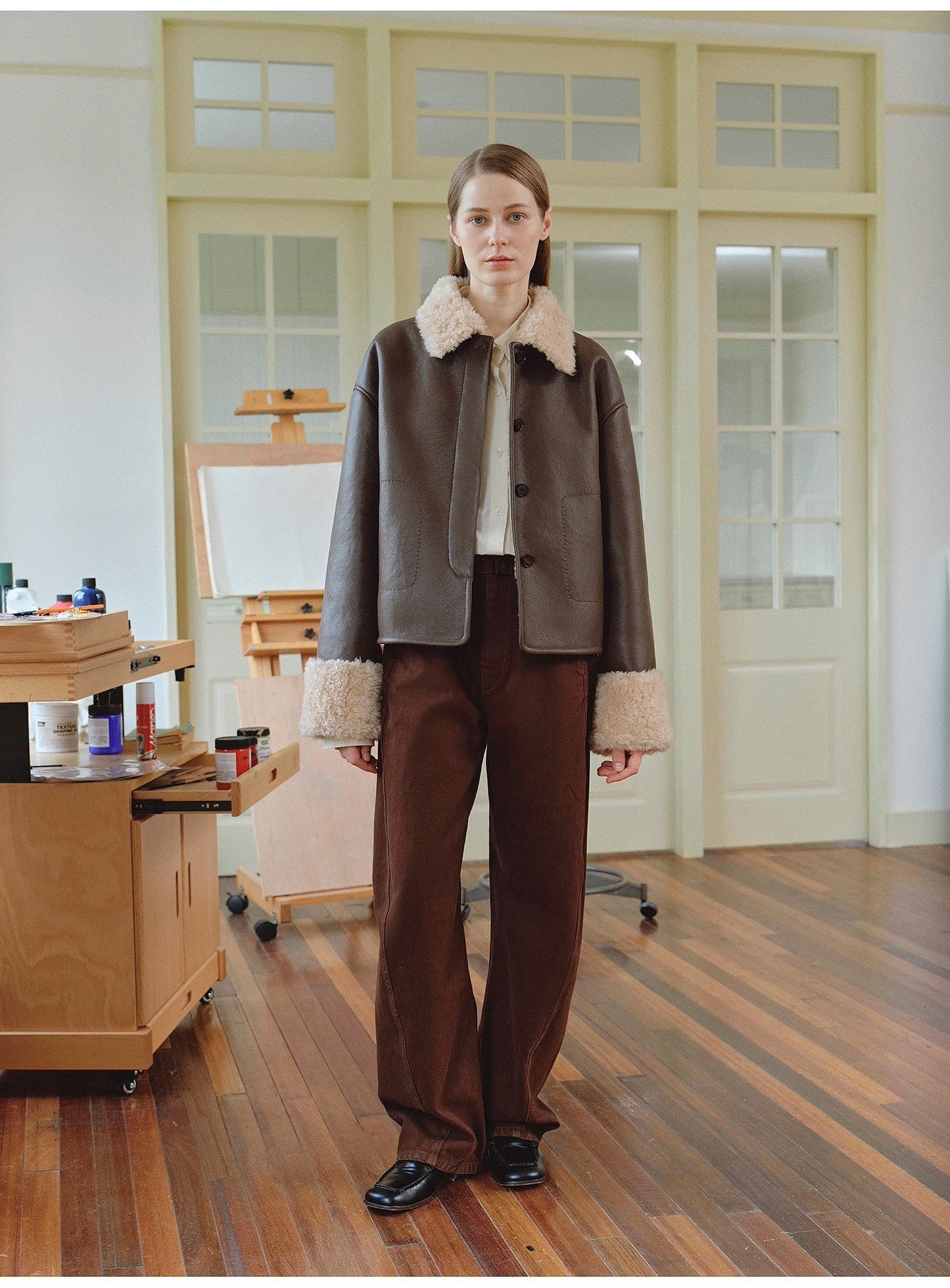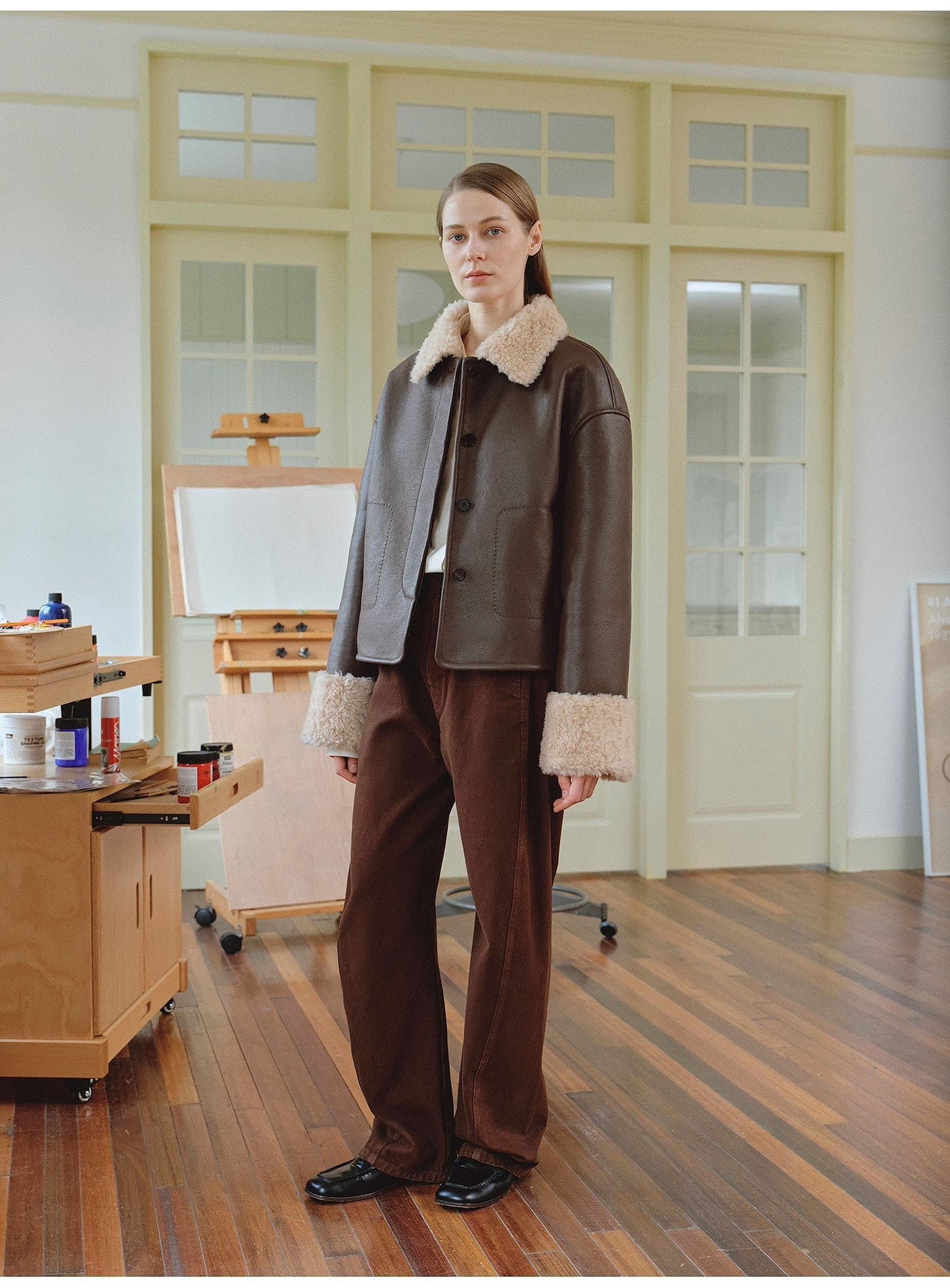 "Slightly Sweet Latte" Furry Lapel Wool Artificial Compound Suede Casual Straight Shearling Jacket