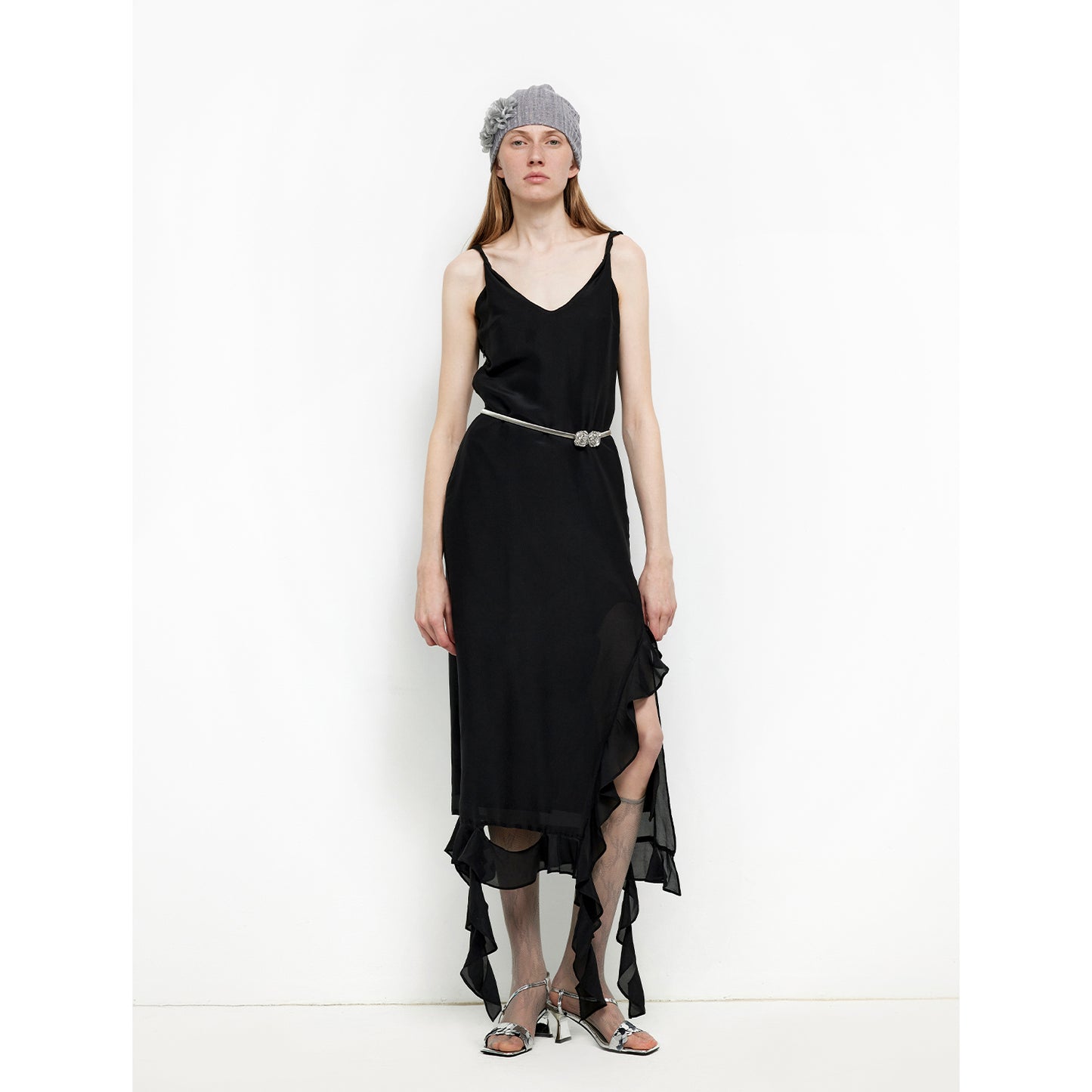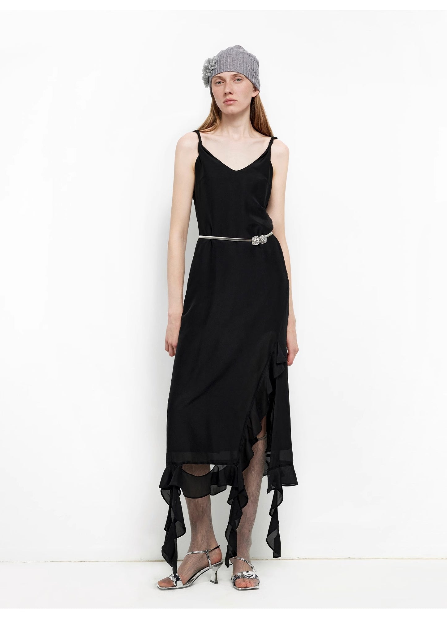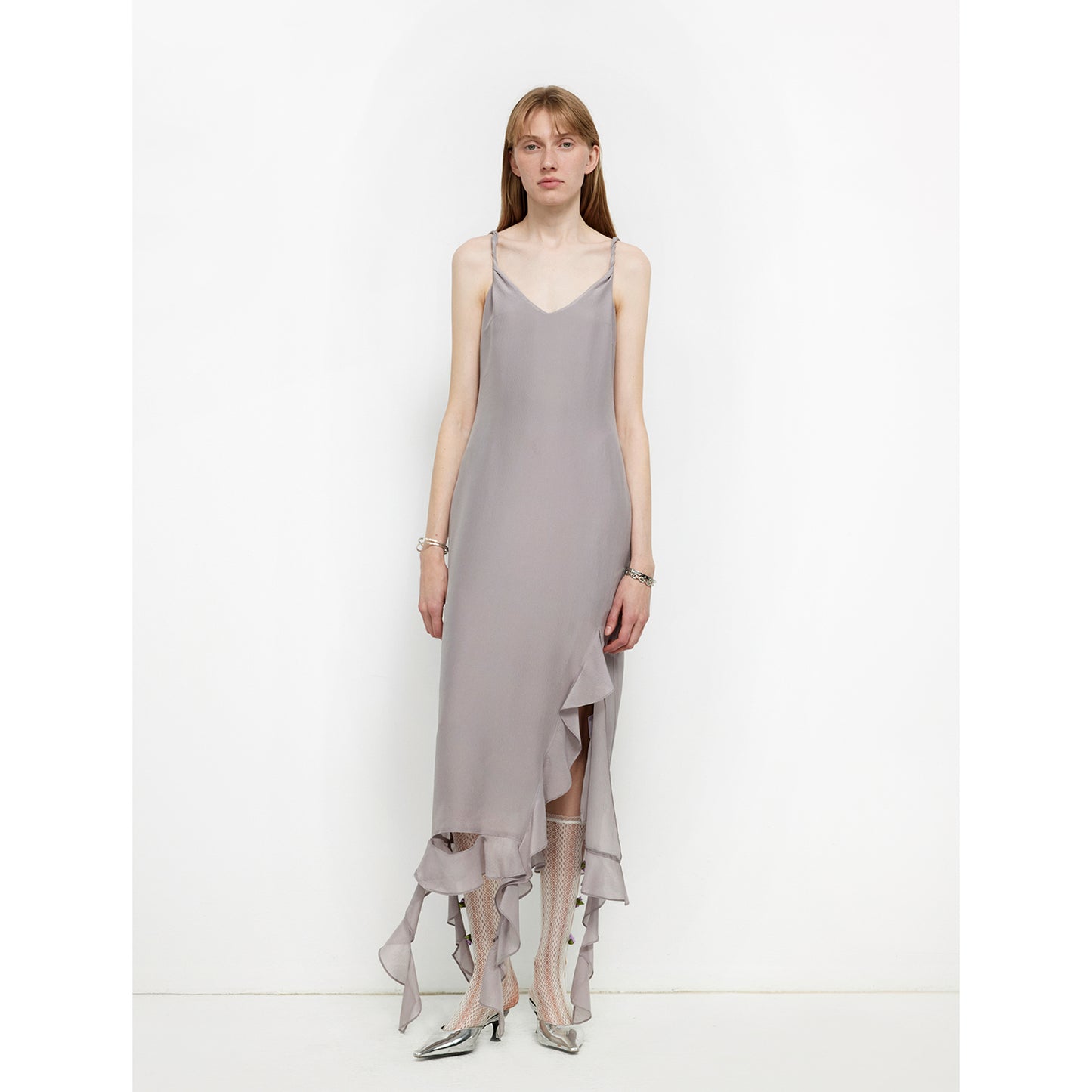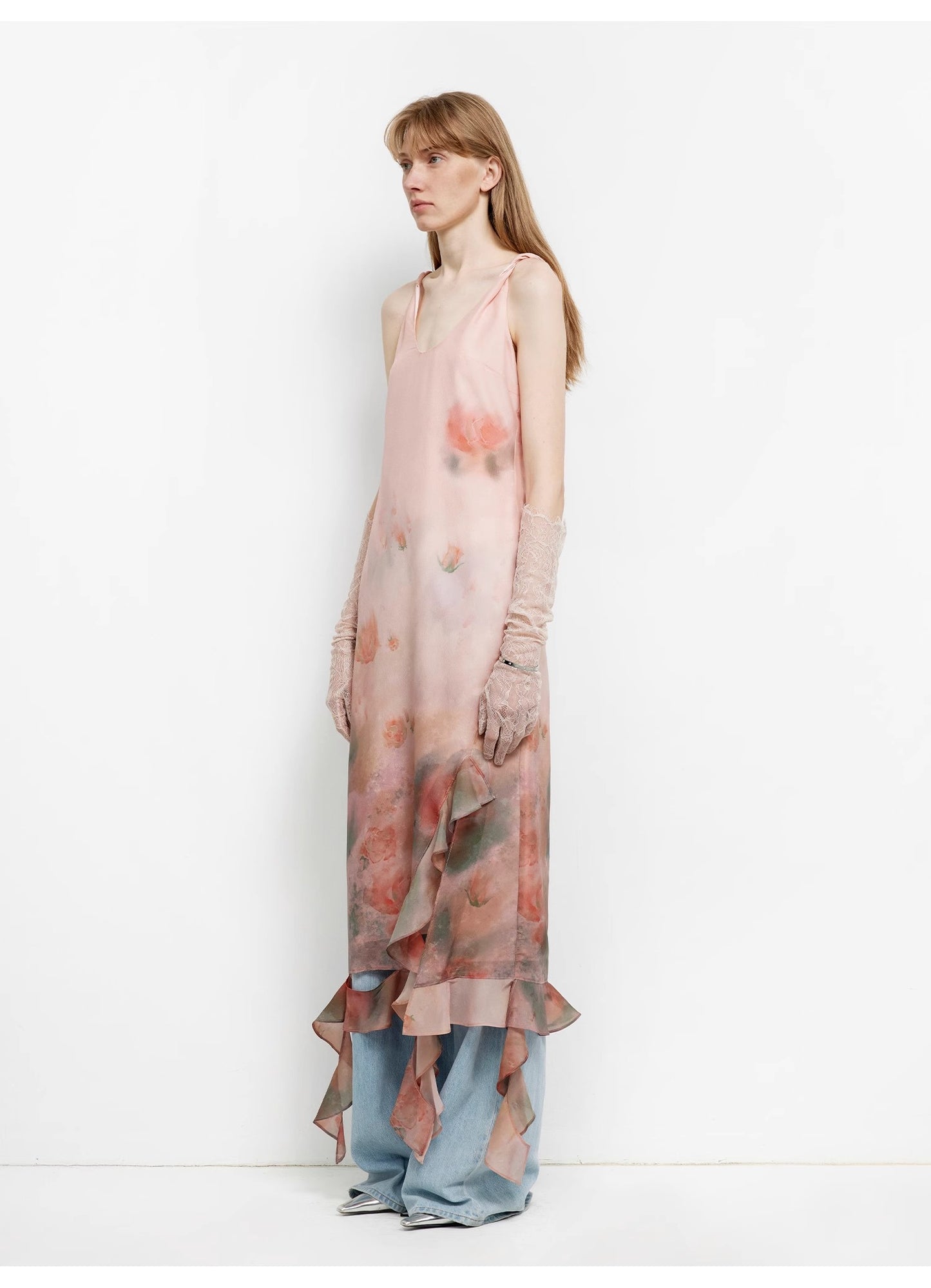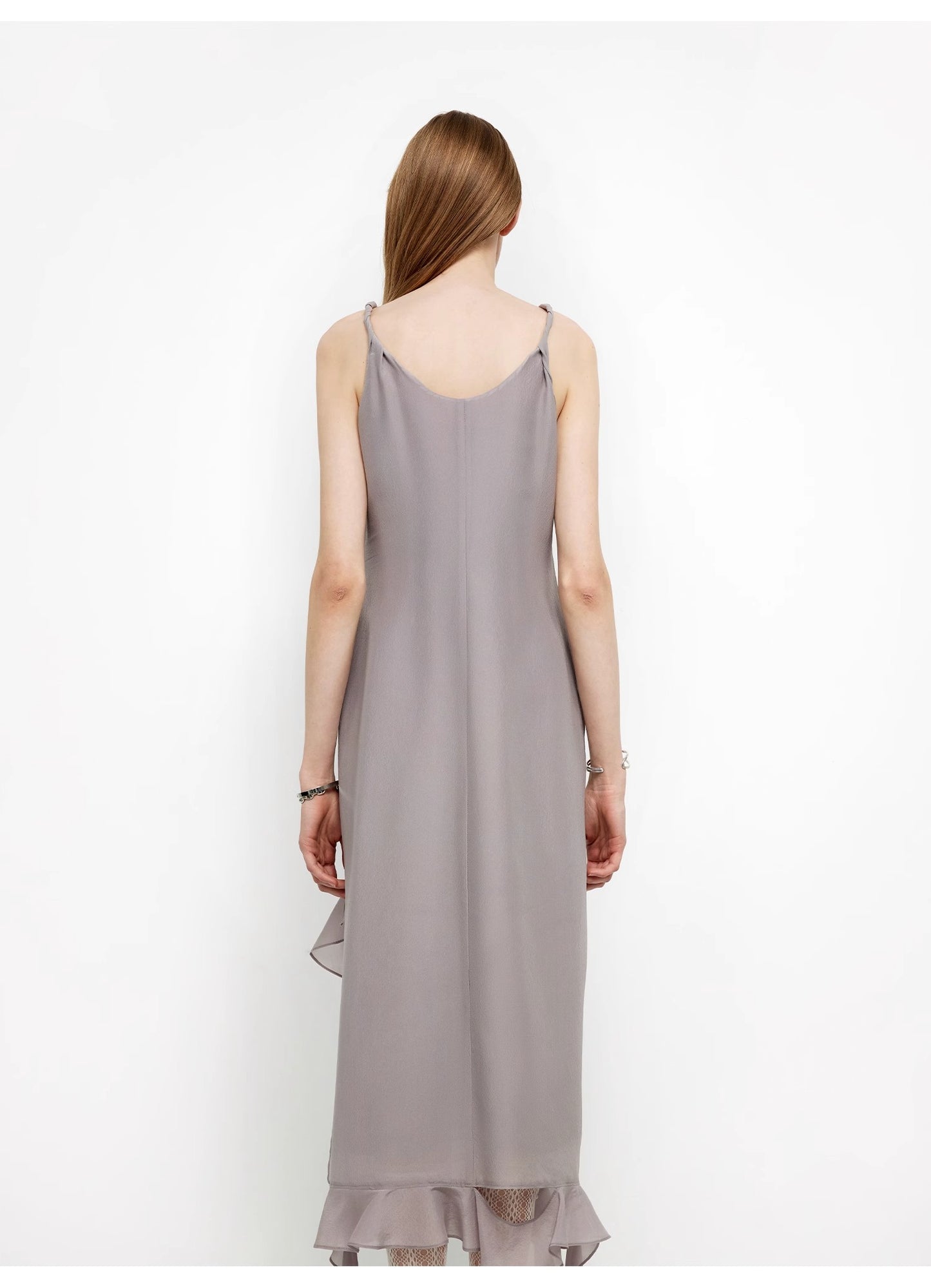"Rosy Ombre" Acetate Mulberry Silk V-Neck Ruffled Draped Twist Strap Summer Dress