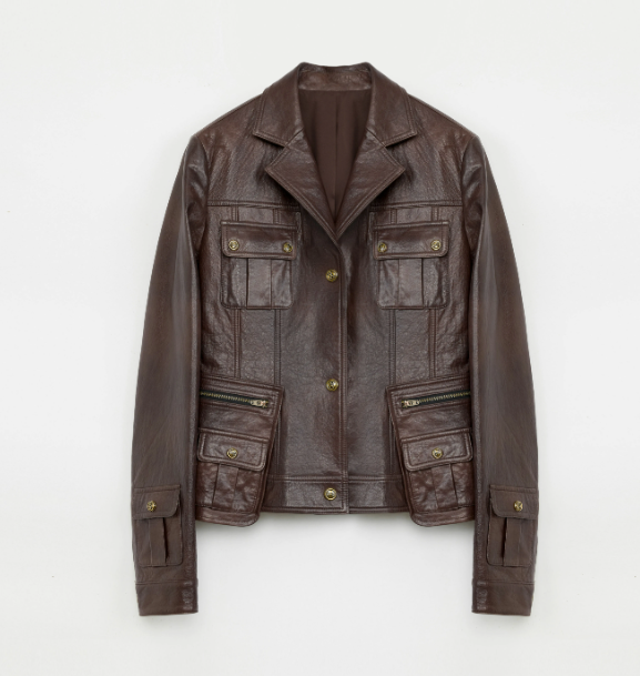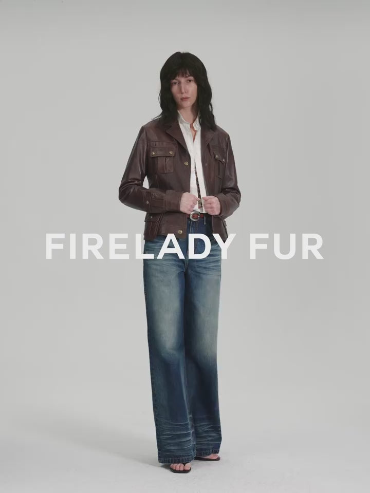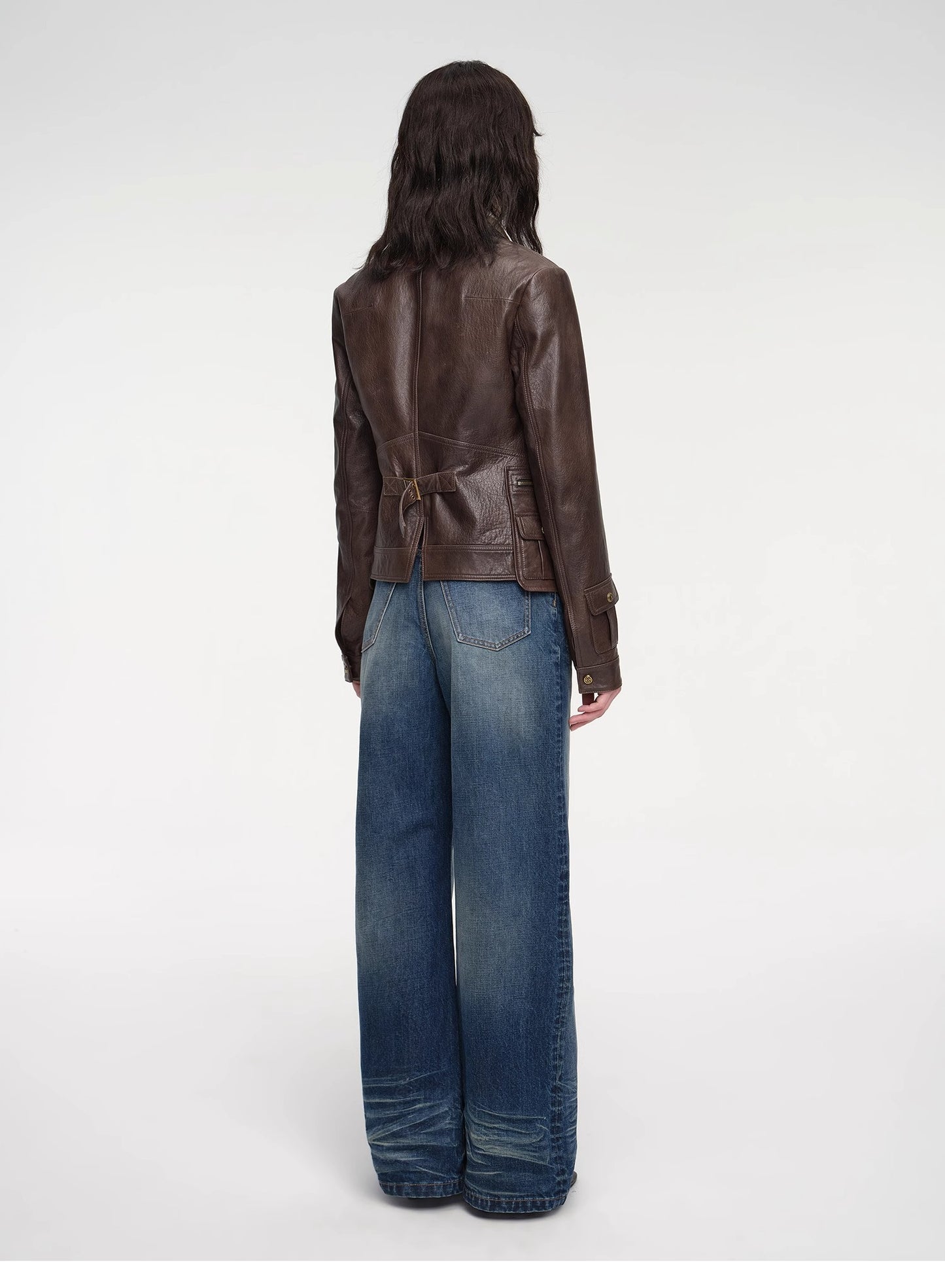 This vintage-style slim-fit leather jacket is crafted from carefully selected soft oiled waxed leather, showcasing a natural oily sheen.Design details include multiple pockets, a back waist strap, and side slits, enhancing the retro charm and giving the garment an antique luxurious feel.