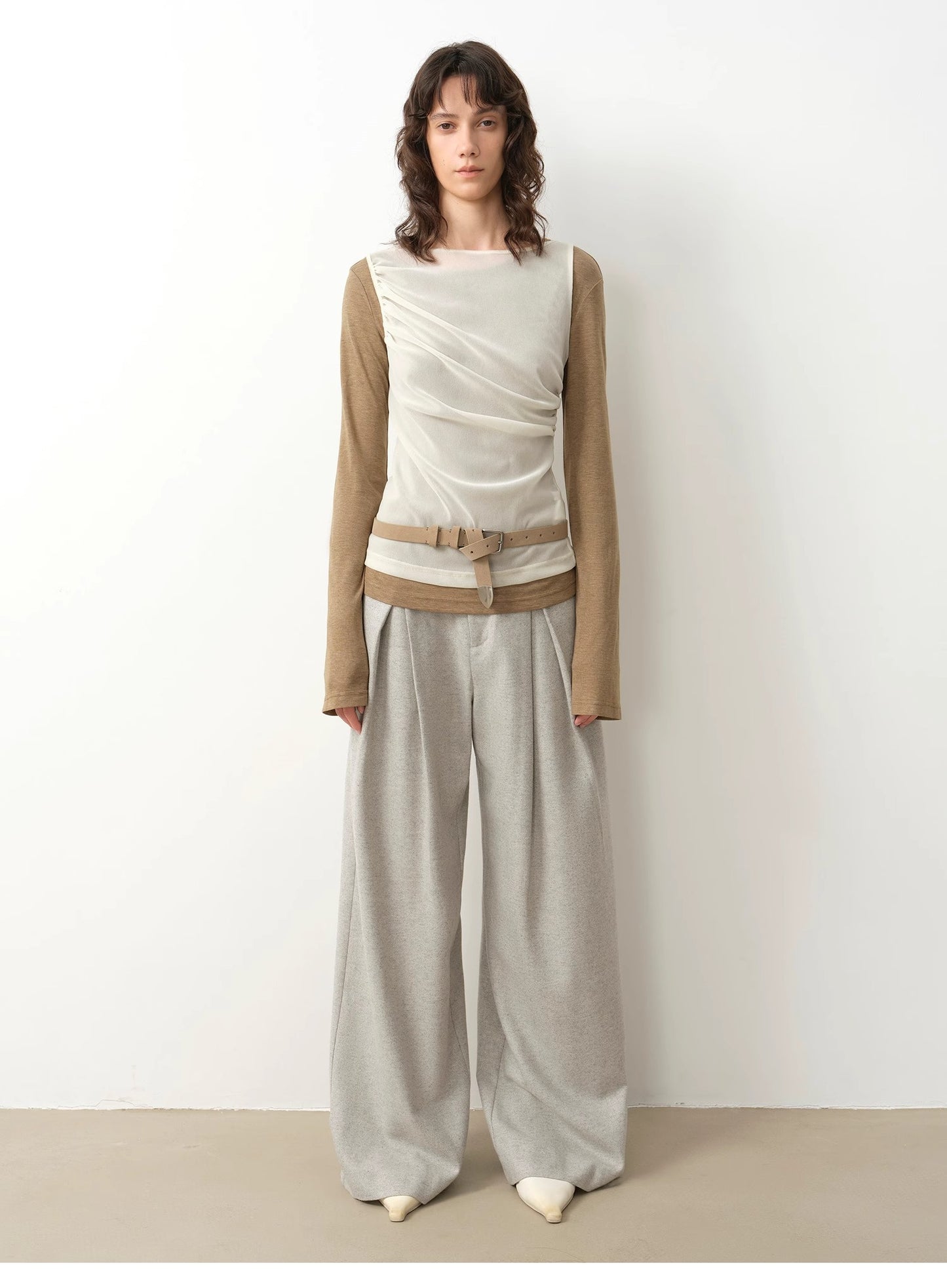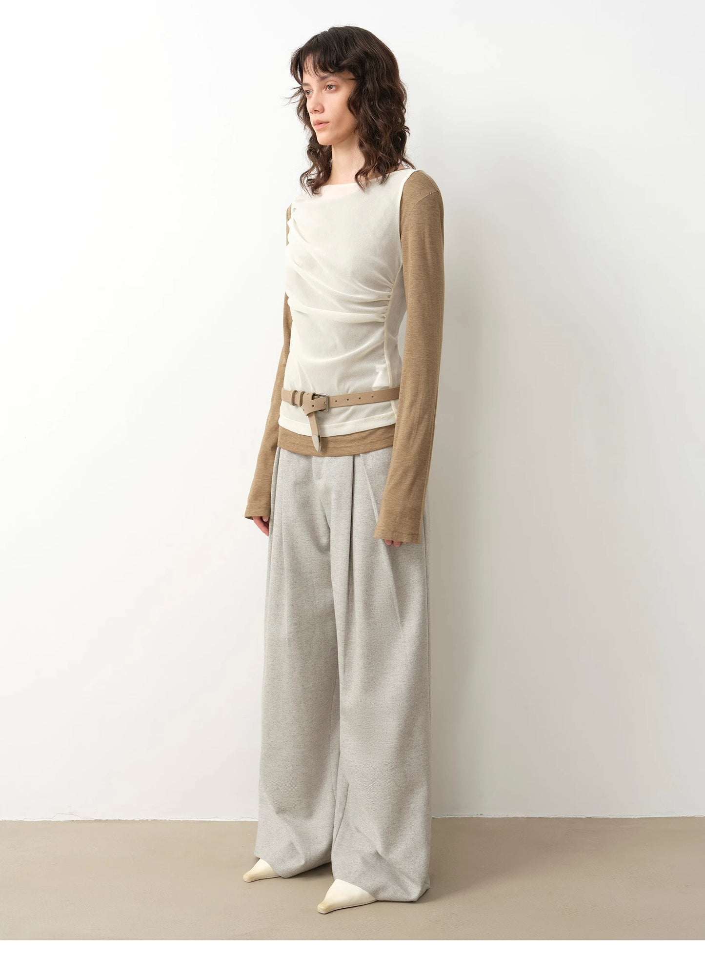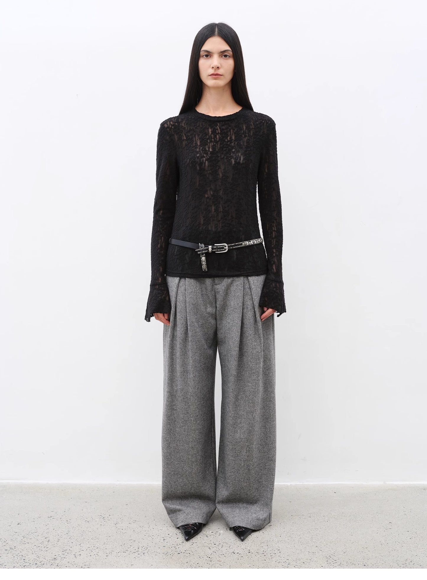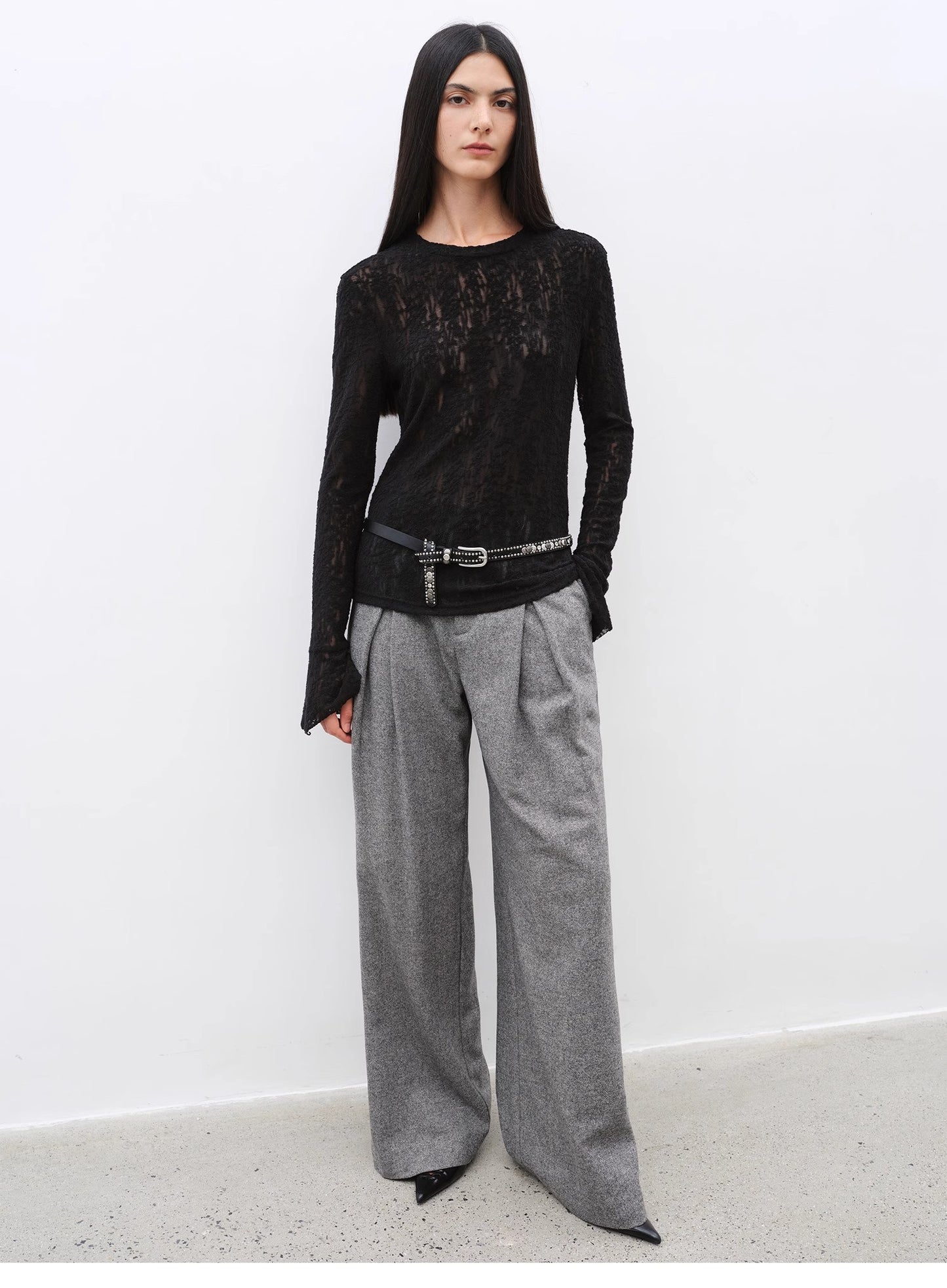 Countless luxury runway essentials, the effortlessly relaxed trousers that supermodels and influencers wear all year round—this iconic pair. The side seam pleats create a long, straight leg line, perfectly enhancing and shaping the lower body. Made from fine wool suiting fabric, the trousers have a sharp, draped silhouette, seamlessly blending with various styling options for a sophisticated, versatile look.