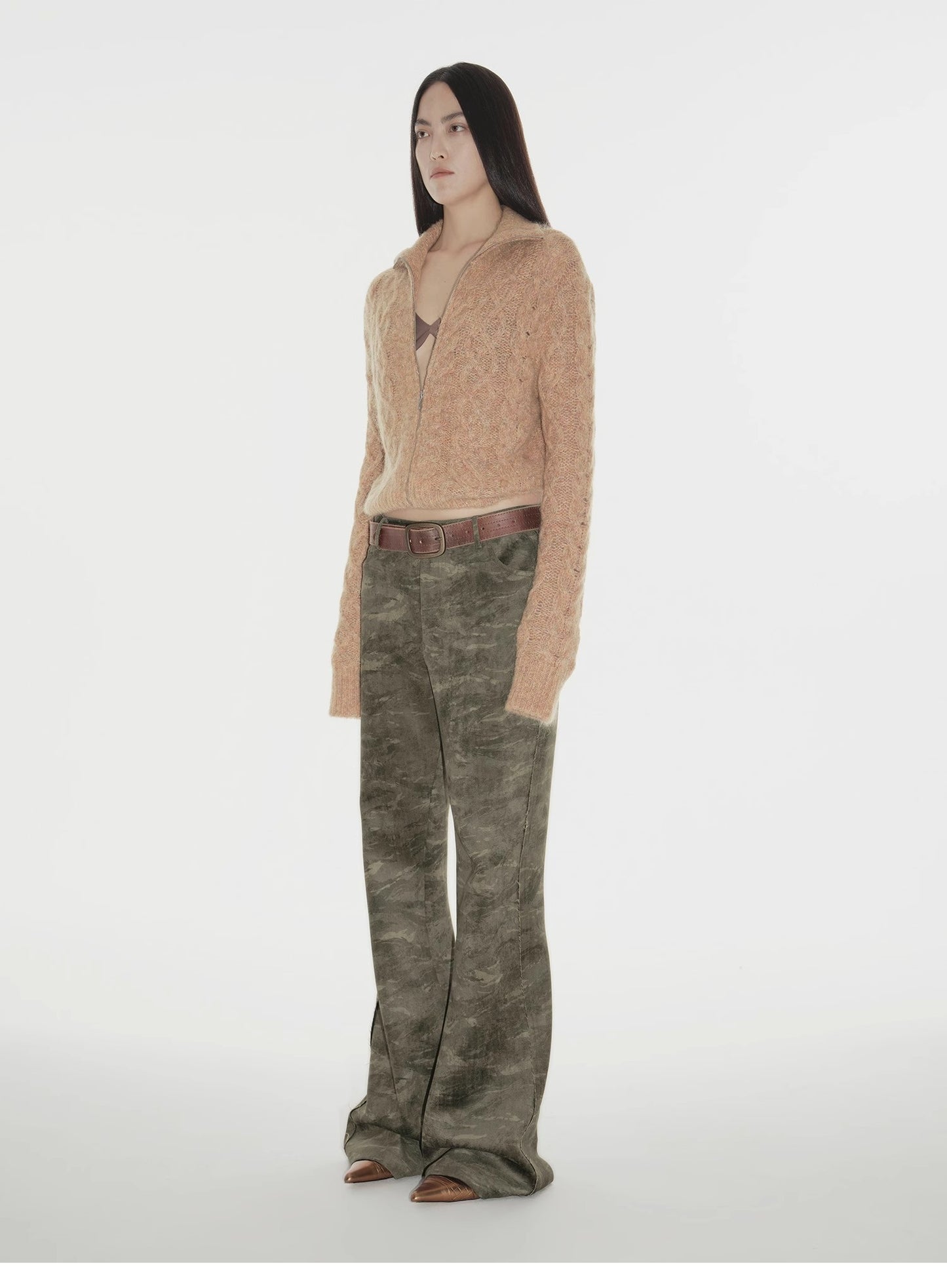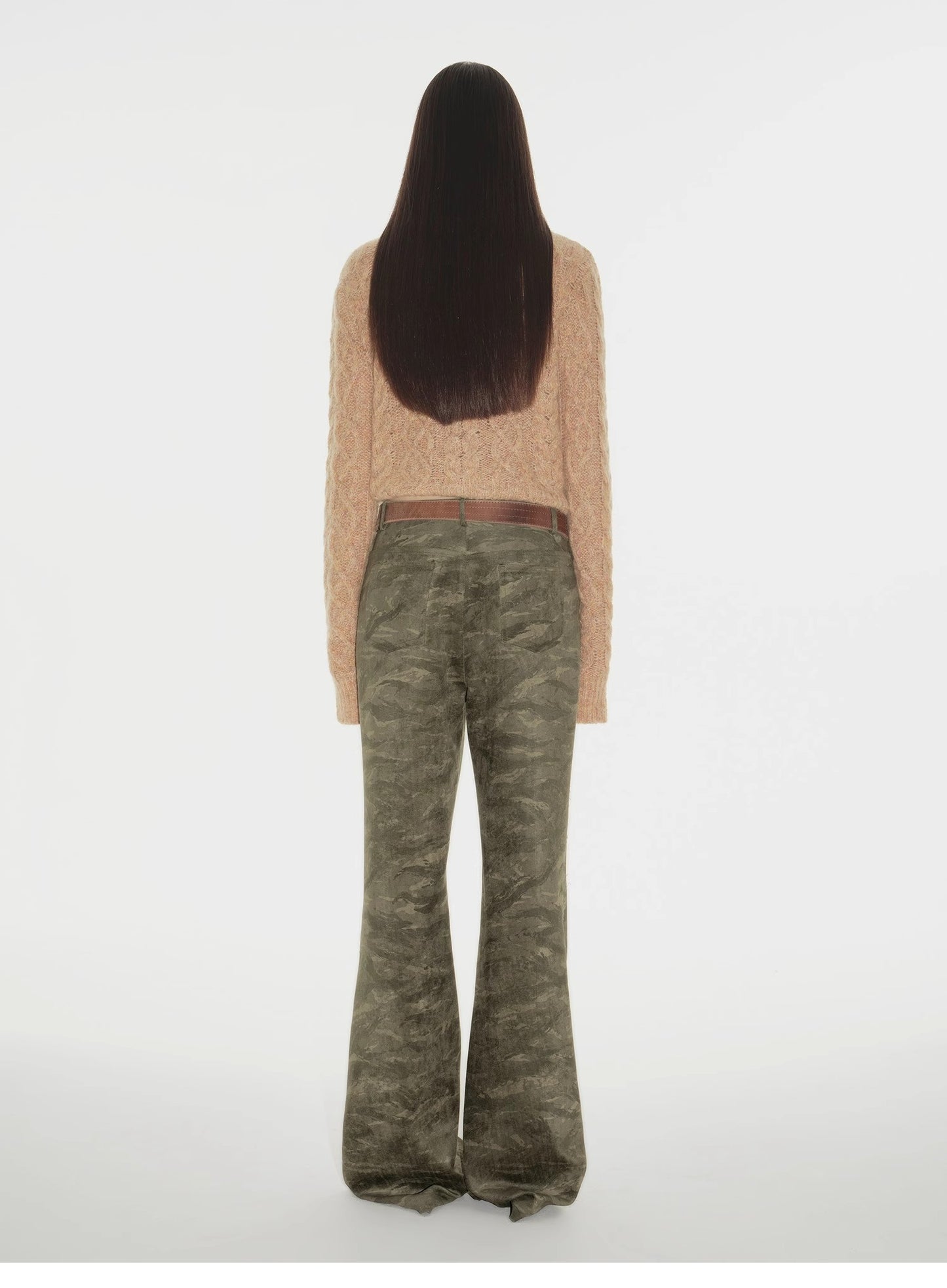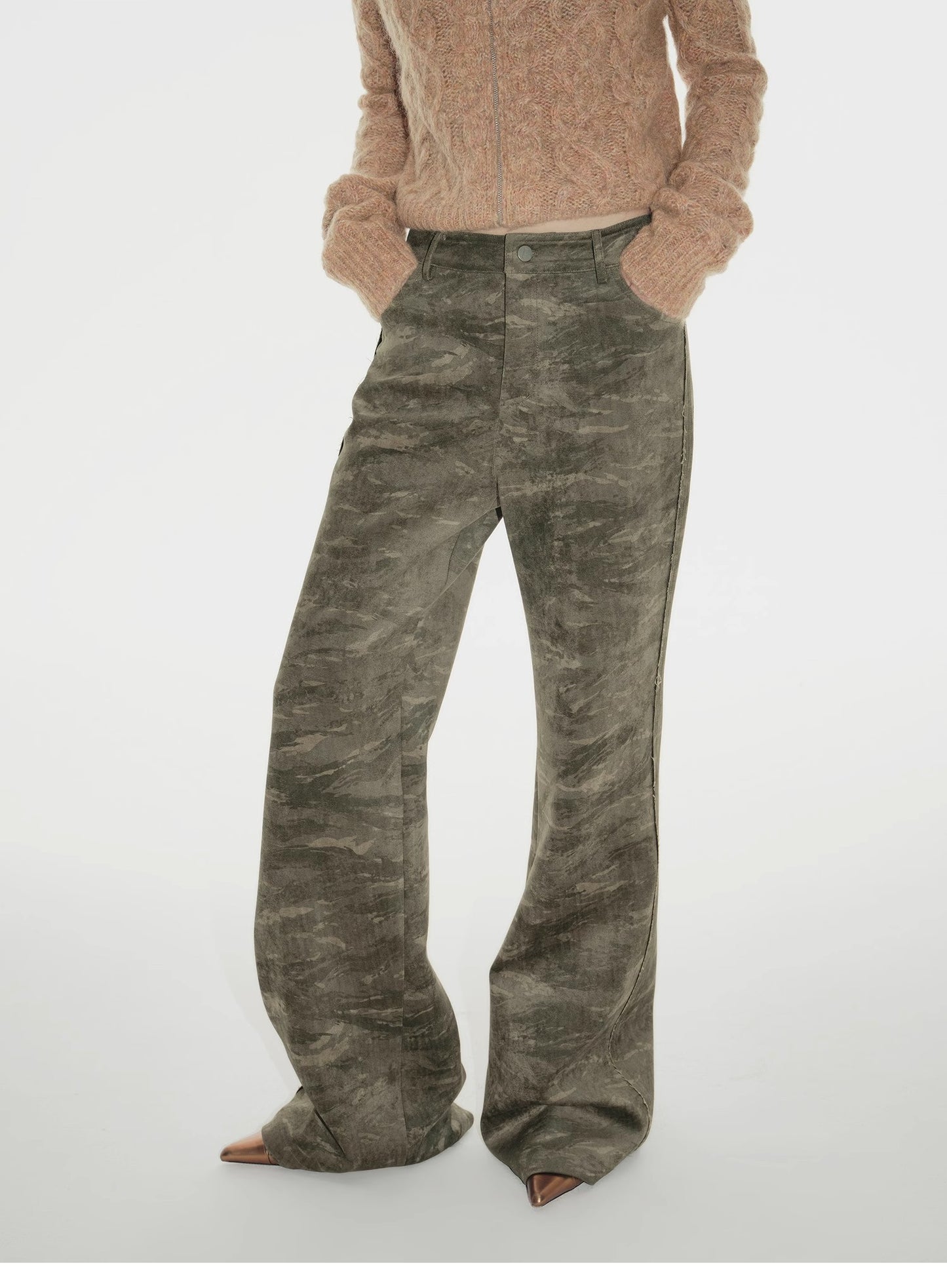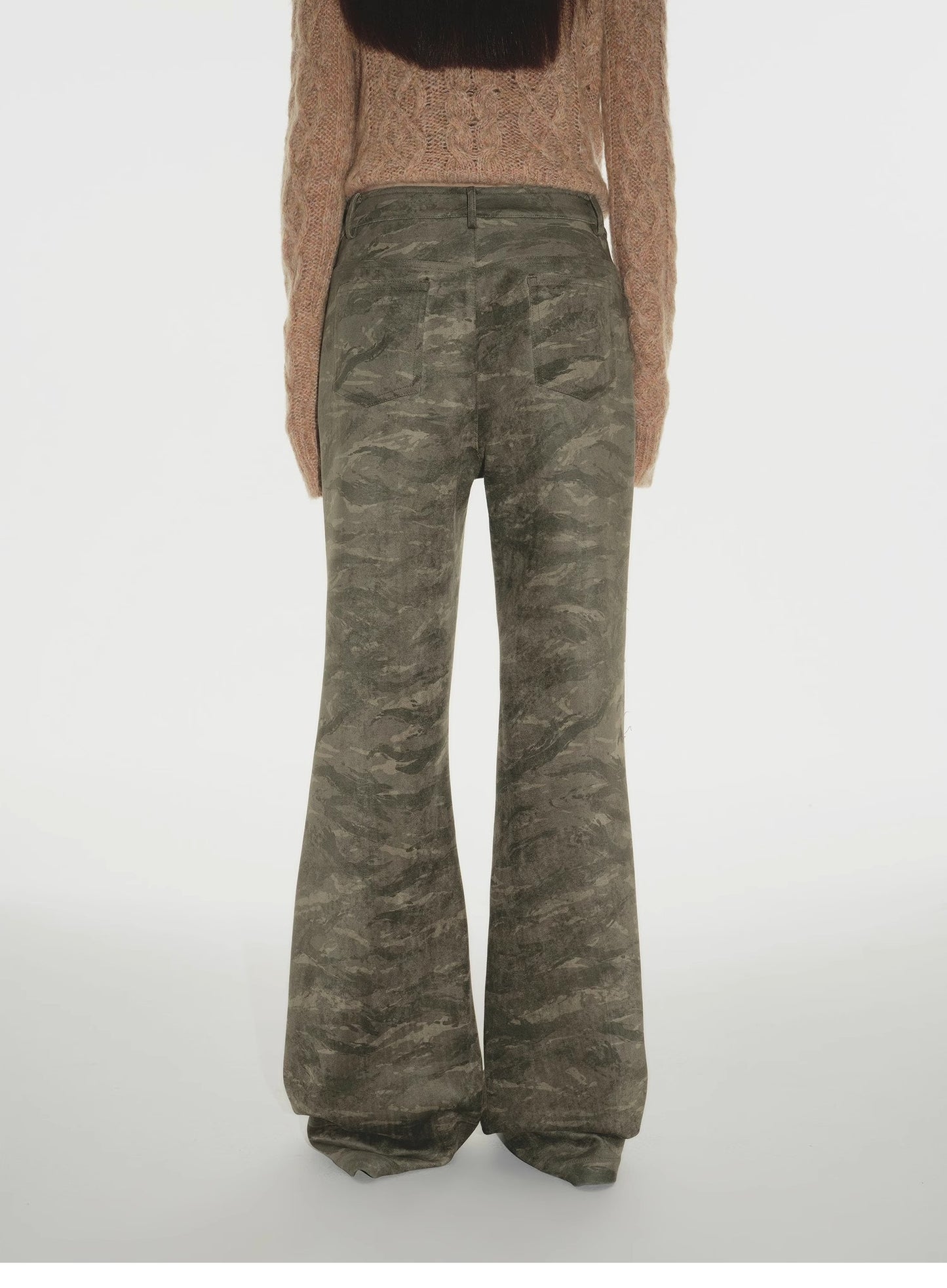 "Green Camouflage"Fashionable and versatile camouflage print chenille suede slim bootcut casual pants