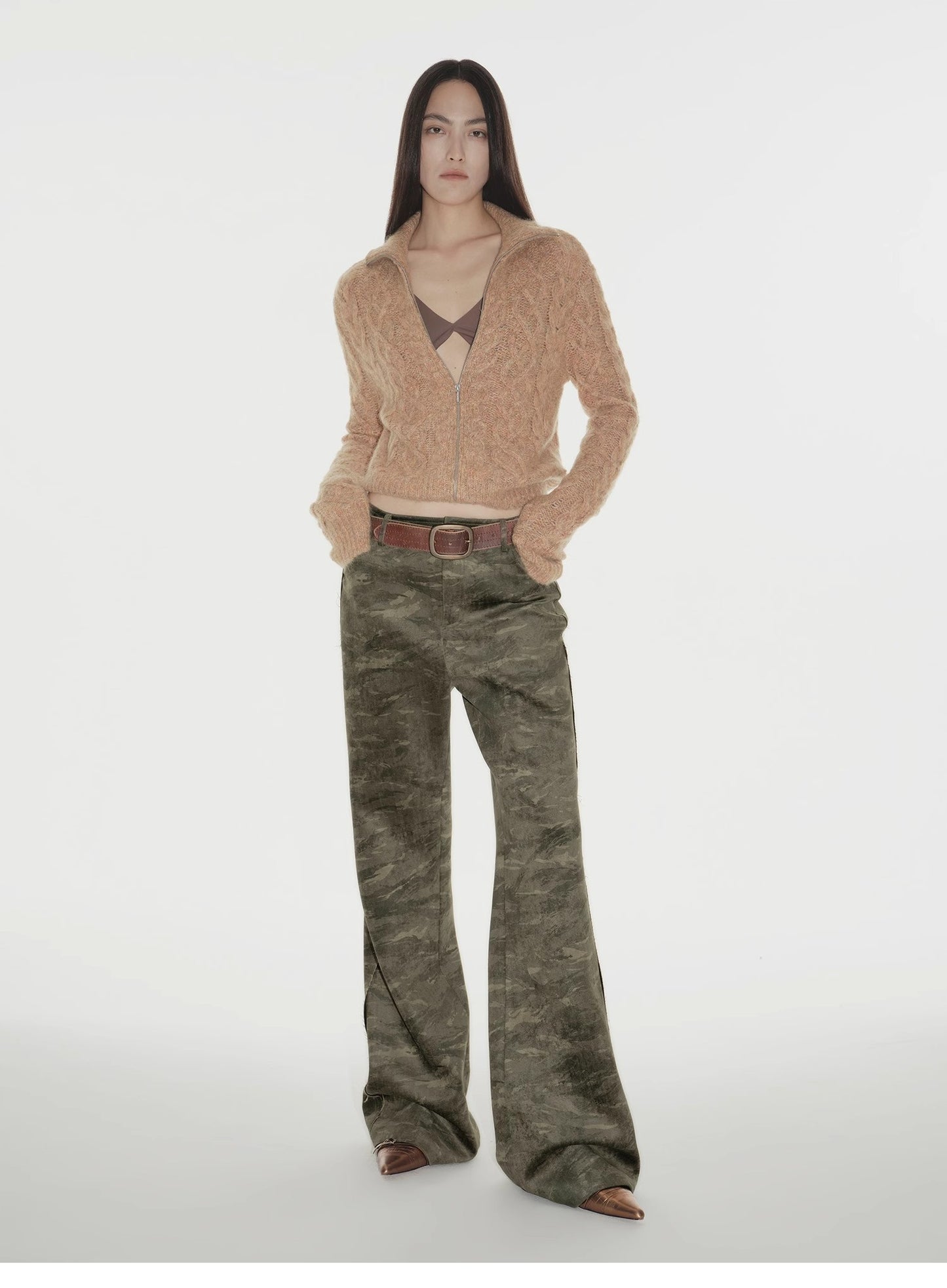 The front is made of 97% fine chenille, and the back is made of skin-friendly acetate fabric. Original camouflage print design and matte suede texture create a retro street style. The overall thickness is soft, light, warm, elastic, refreshing, and not stuffy.