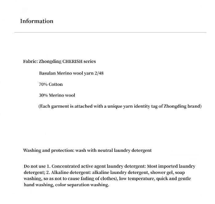 After undergoing a Basolan anti-shrink treatment, the internal structure of the wool fibers is altered, allowing the garment to retain its like-new condition even after multiple washes. Compared to ordinary yarns on the market, it is more comfortable, skin-friendly, and as soft and smooth as baby’s milk-like skin. It also provides a certain degree of anti-felting and shrinkage performance, offering an elevated quality experience from the inside out.