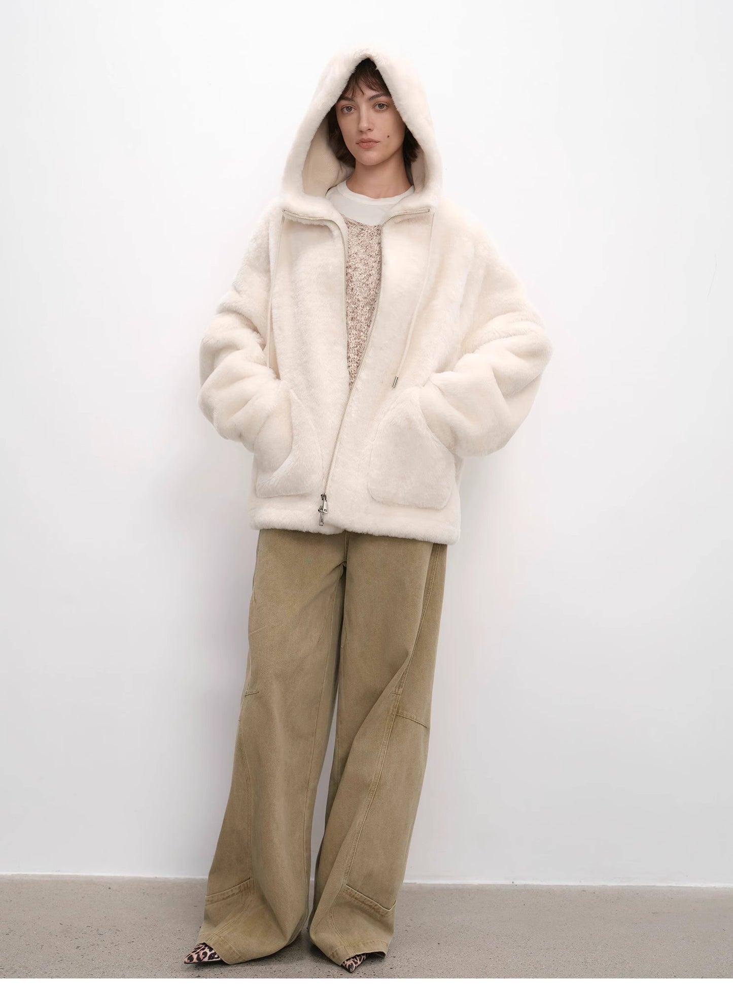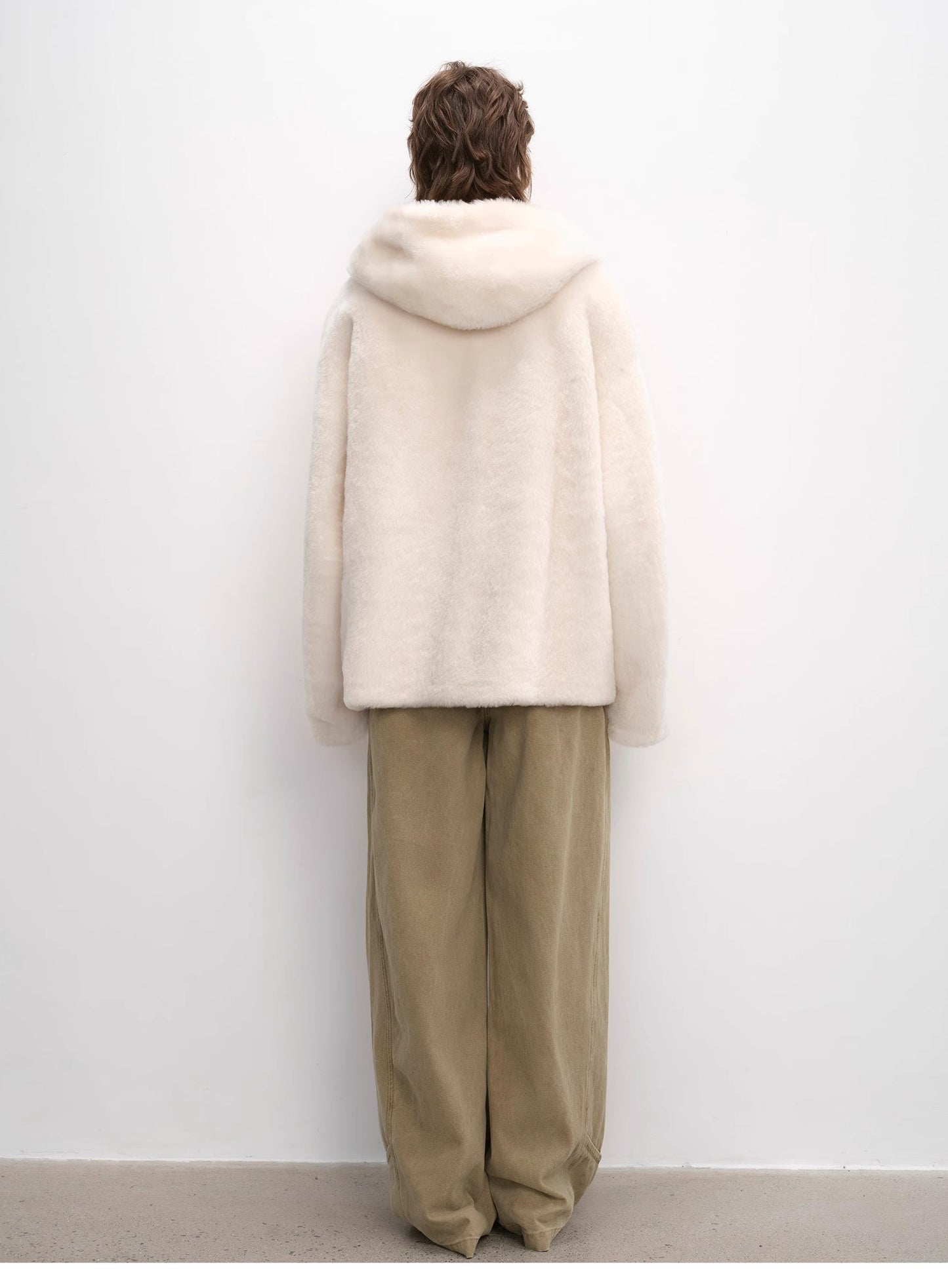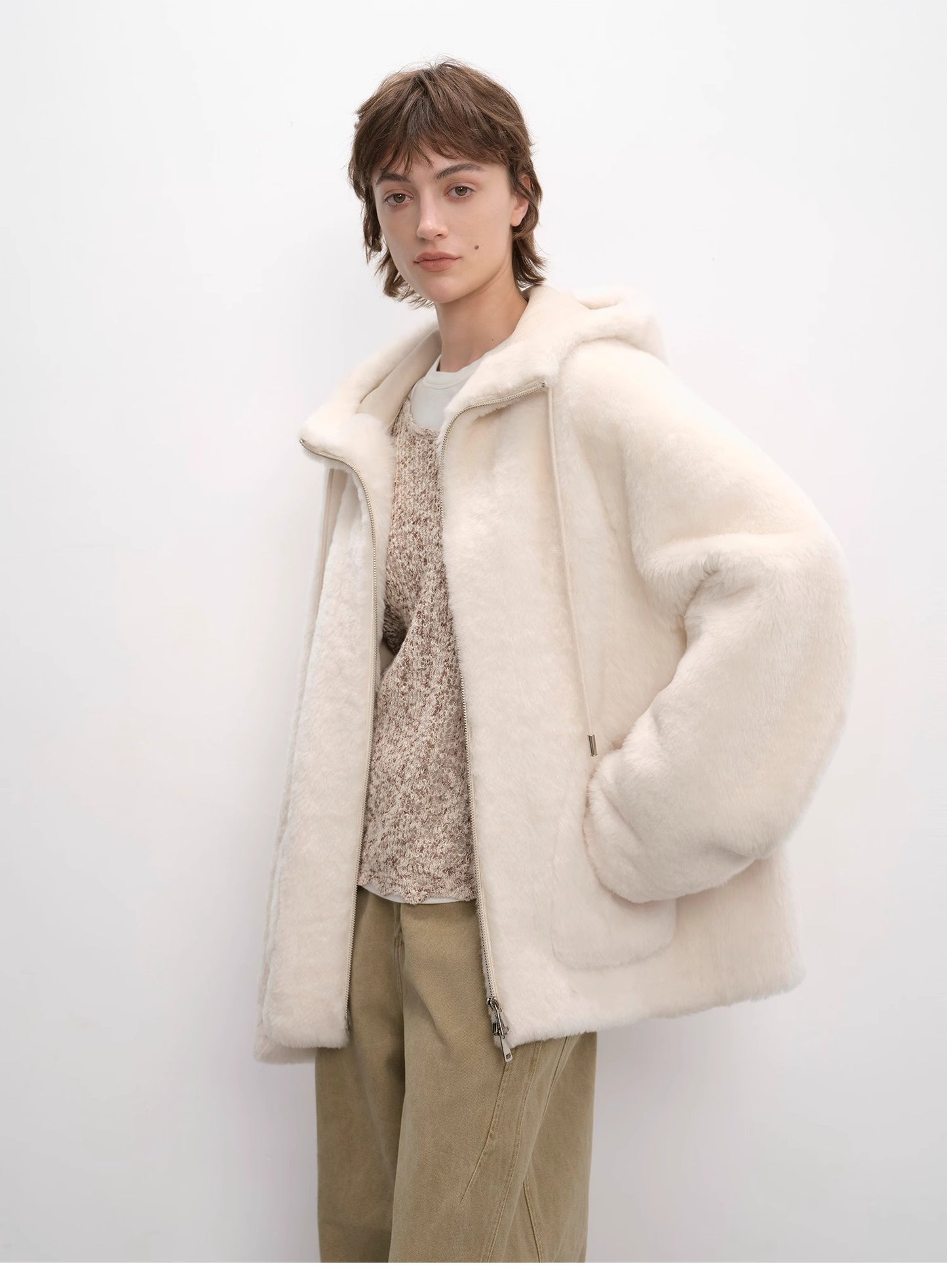 "Otaru Snow" casual hooded silhouette dropped shoulder merino wool sheepskin fur coat for women