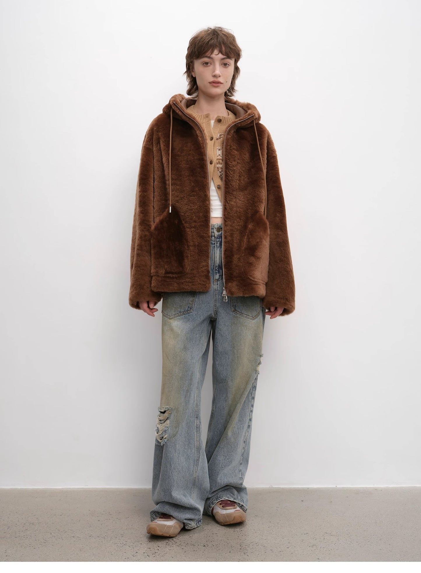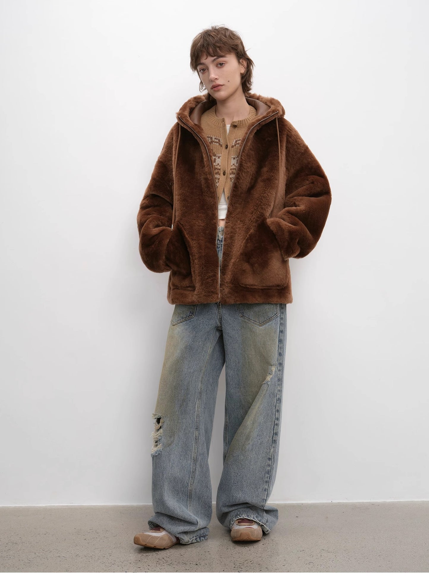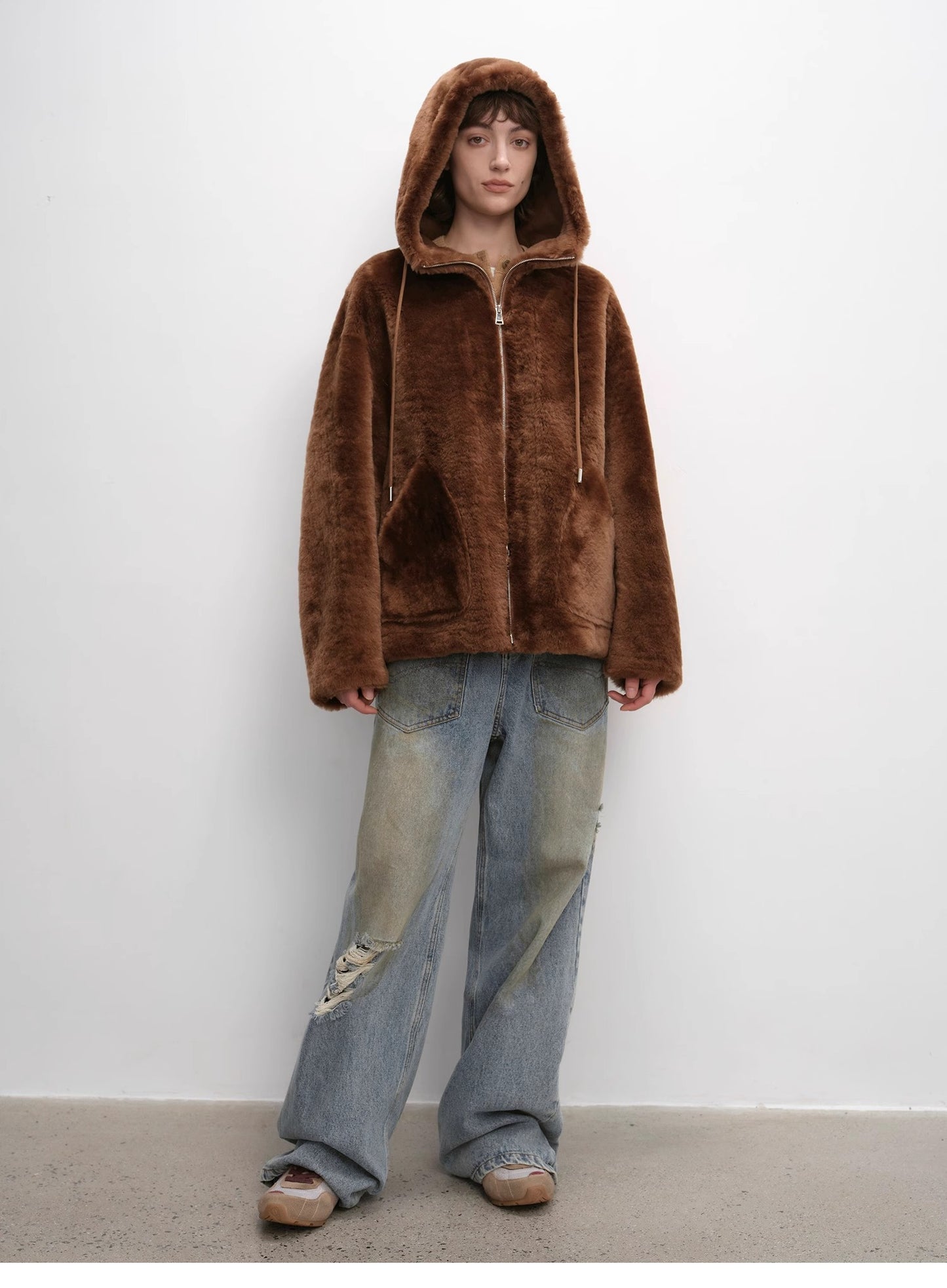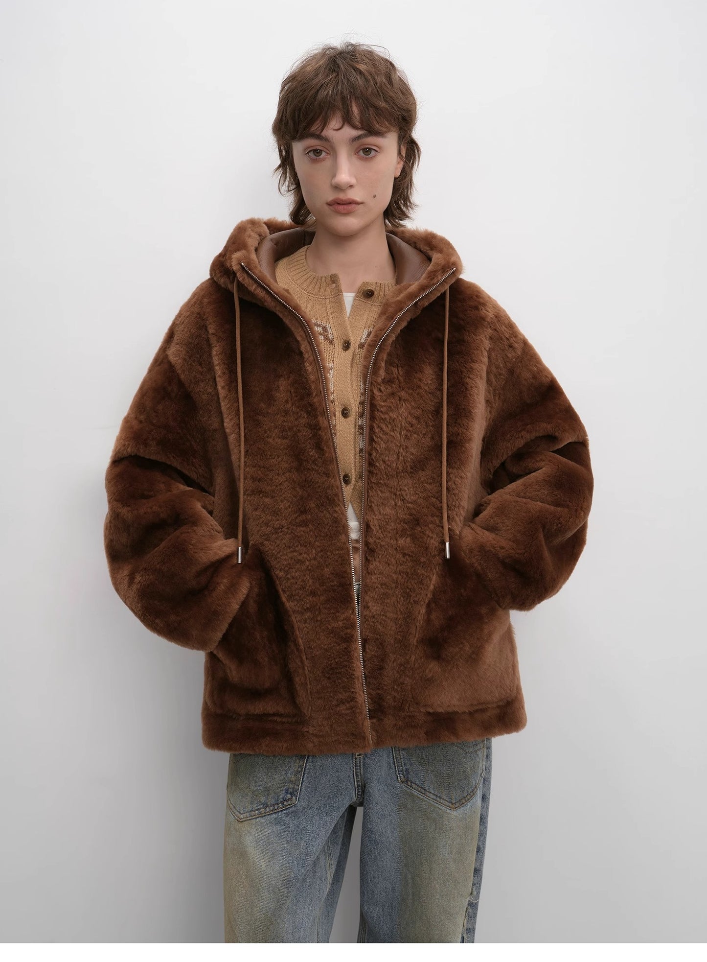 "Otaru Snow" casual hooded silhouette dropped shoulder merino wool sheepskin fur coat for women