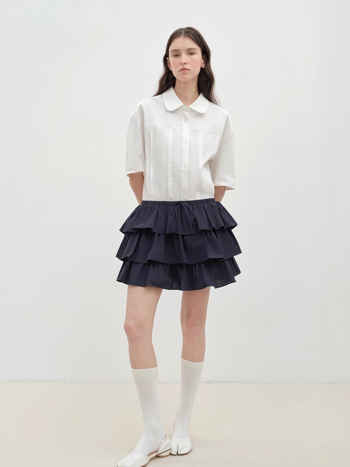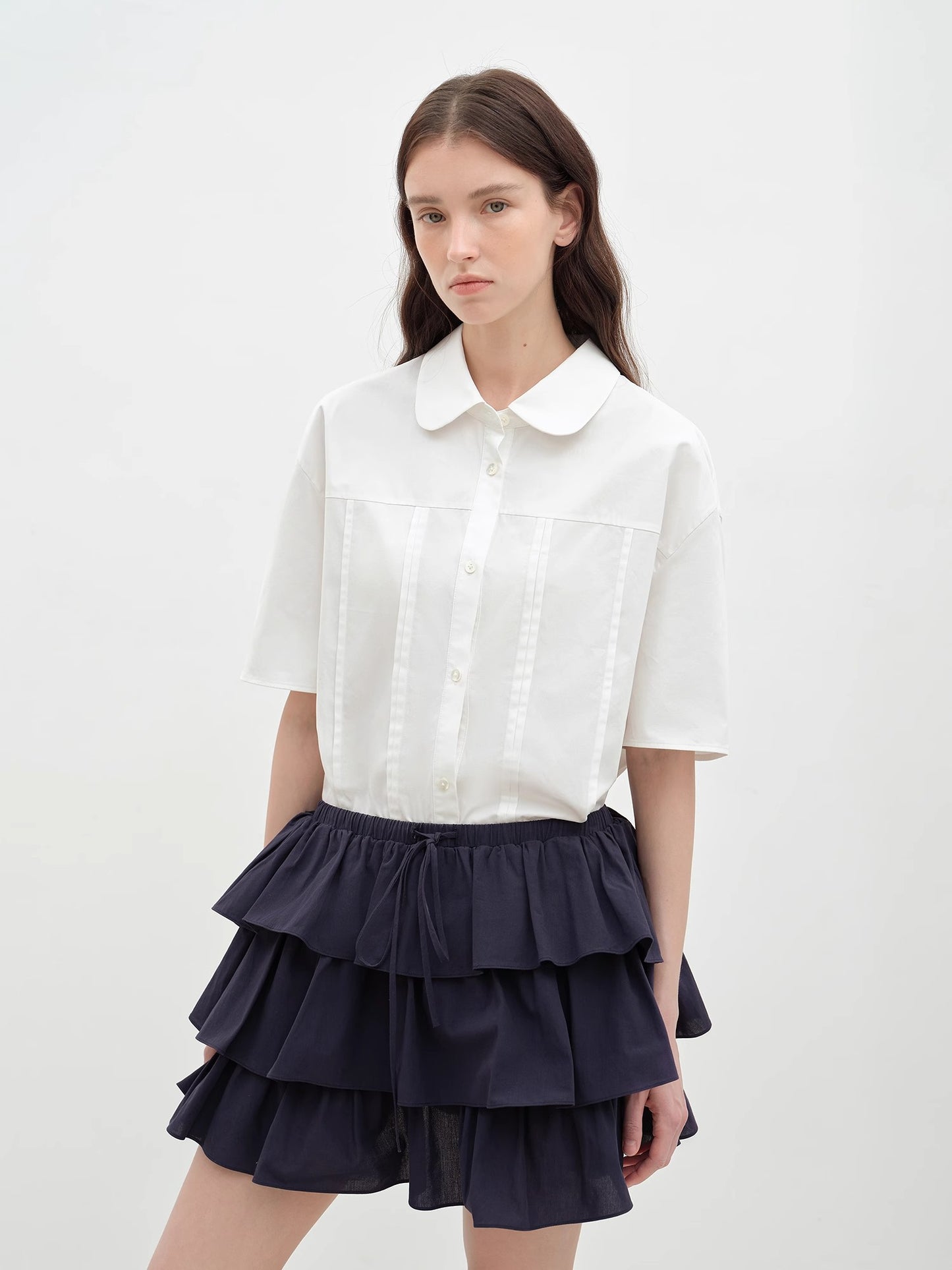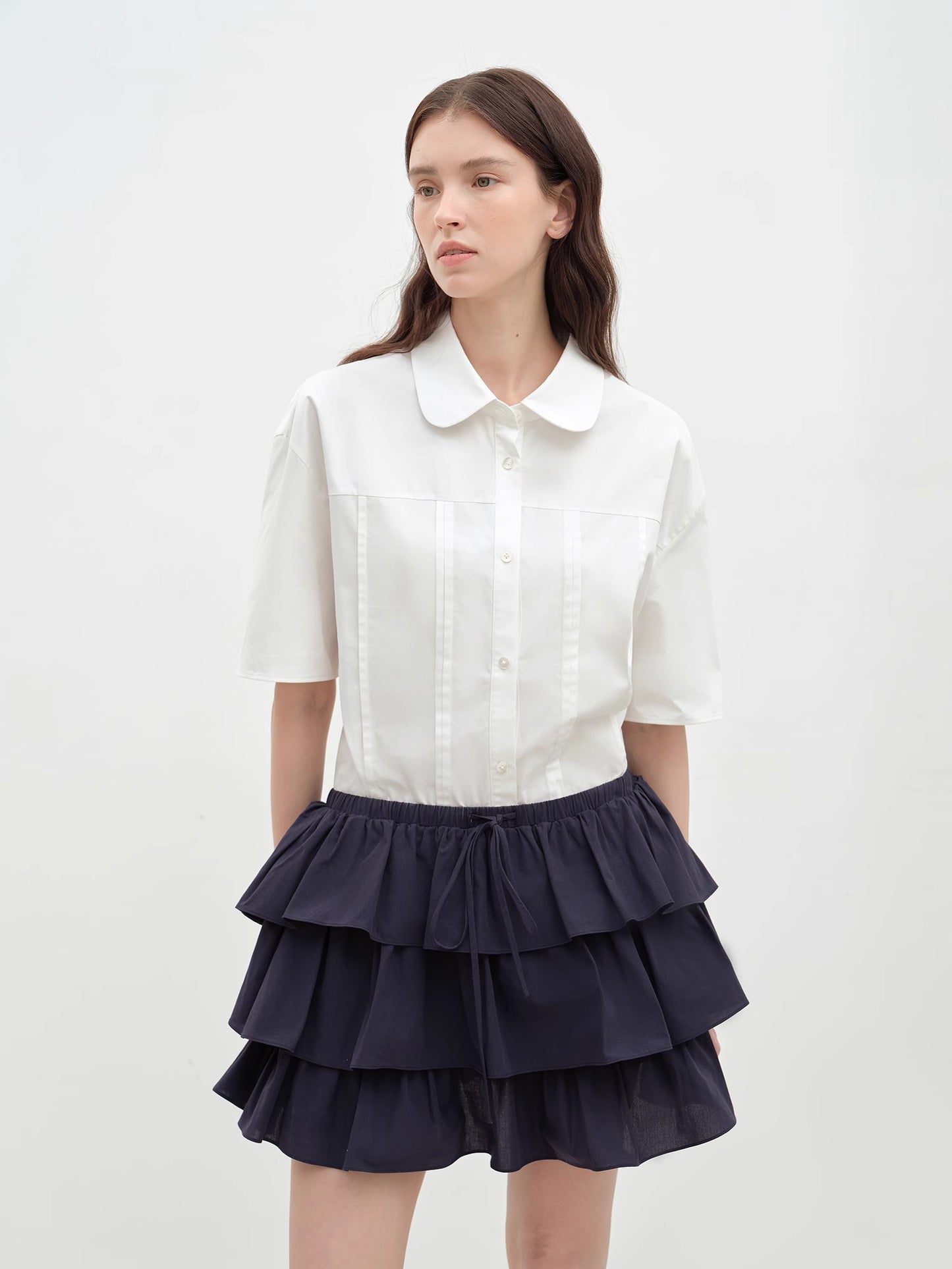 Premium long-staple cotton for soft, skin-friendly comfort with subtle structure; smooth weave in fresh tones. Delicate collar adds elegant simplicity; irregular accordion pleats bring intricate design and sweet youthfulness. Relaxed straight fit offers easy comfort, with asymmetrical pleats creating dynamic visual layers for a flattering.